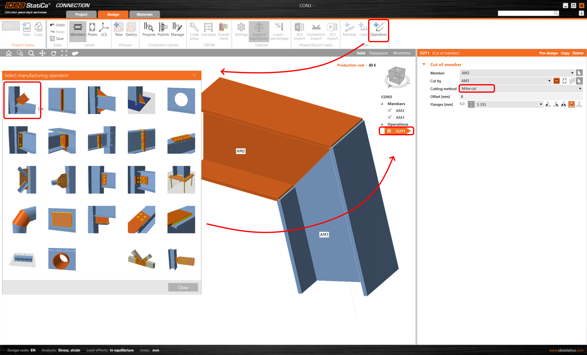 Commencez par l'assemblage CON1 à la base du poteau gauche. Le module de l'application IDEA StatiCa Connection s'ouvre et vous pouvez concevoir l'assemblage en ajoutant des opérations de fabrication.