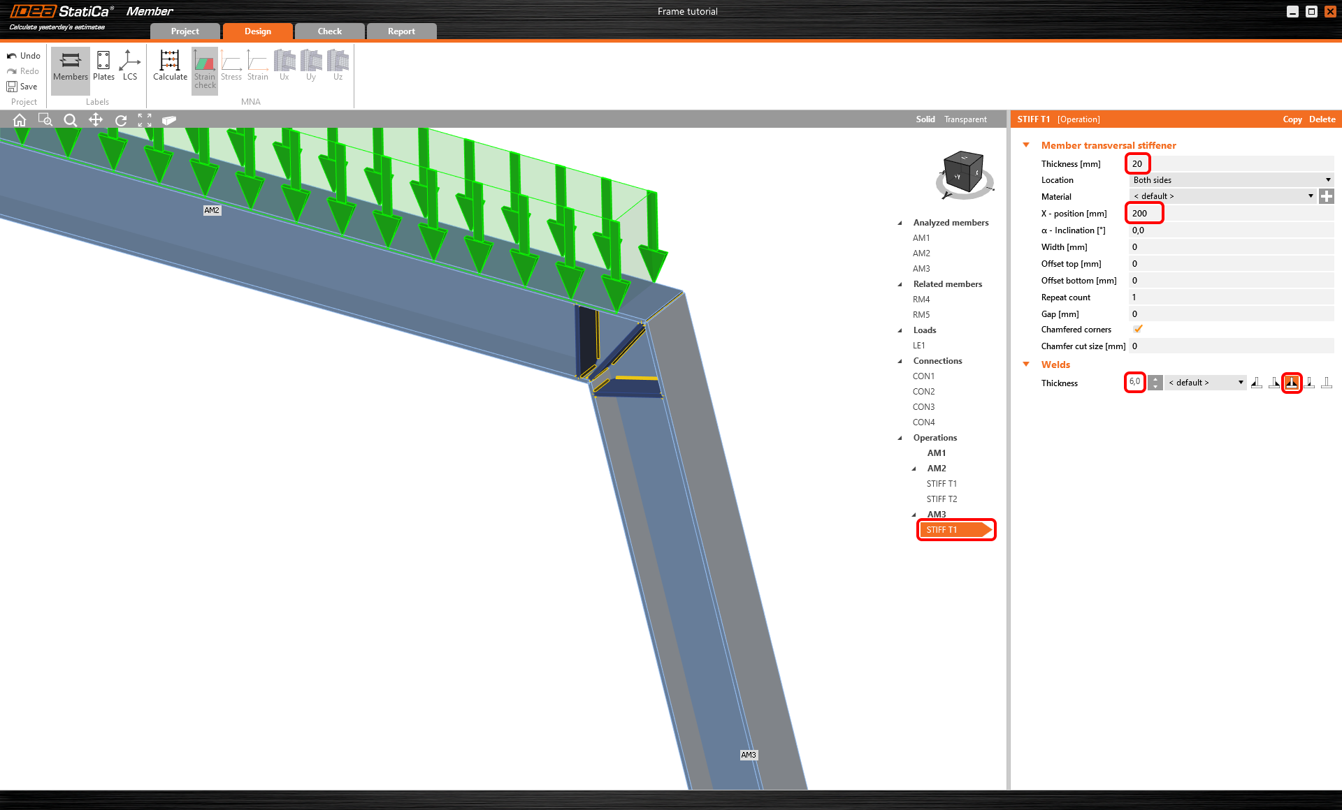 Puis modifiez les paramètres du raidisseur et ajoutez un autre raidisseur transversal à la même poutre AM2 et un autre au poteau AM3 et paramétrez-les dans la position correcte.