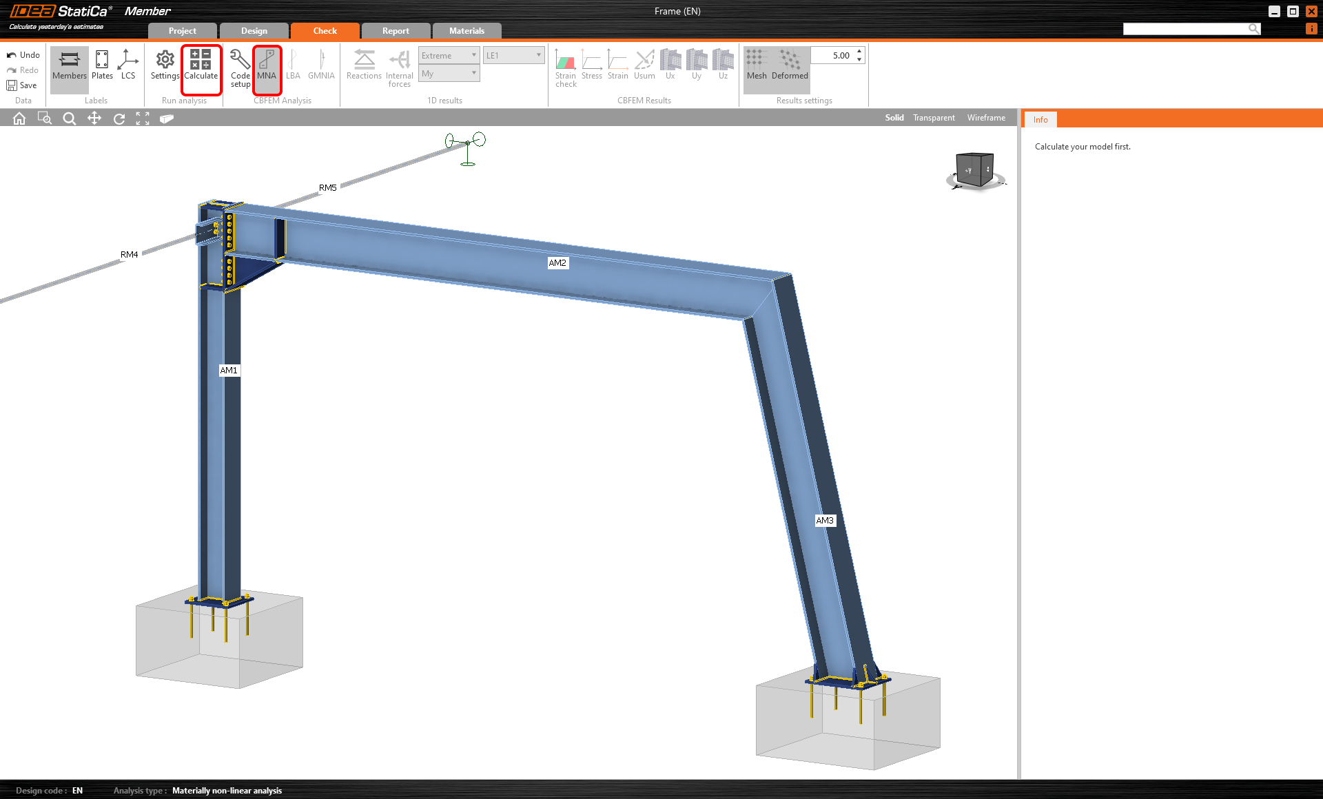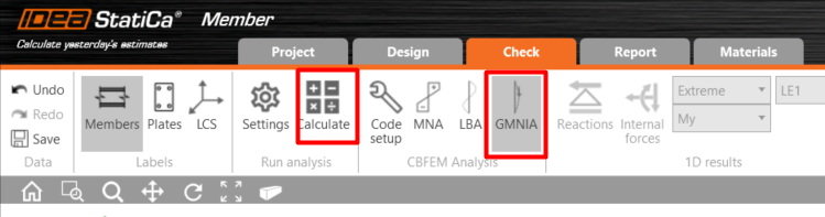 Procédez à l'onglet Vérification et effectuez l'analyse. L'analyse dans IDEA StatiCa Member est calculée en trois étapes en utilisant la technologie CBFEM. Tout d'abord, effectuez la MNA (analyse non-linéaire matérielle) pour vérifier la capacité structurale, puis calculer la LBA (analyse de bifurcation linéaire) pour examiner la stabilité structurale et enfin saisissez des imperfections initiales pour des formes de voilement appropriées et calculez la GMNIA (analyse non-linéaire matérielle et géométrique).