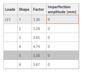 Quand au moins un facteur de forme de voilement est inférieur à 15, changer pour GMNIA pour effectuer l'analyse non-linéaire de stabilité structurale. Selon EN 1993-1-1, sélectionnez la forme de voilement la plus critique ou une combinaison des formes de voilement et saisissez l'imperfection initiale de la poutre critique. Dans ce cas, sélectionnez la première forme de voilement 1 comme la plus critique. Changez pour l'onglet GMNIA dans le panneau droit et précisez l'imperfection de 9 mm (0,5xL/300 = 0,5*5400/300 = 9 mm) – tapez-le au champ Amplitude dans la colonne 1. Puis encore une fois cliquez sur le bouton Calculer. Dans ce cas-là, l'analyse peut prendre quelques minutes.