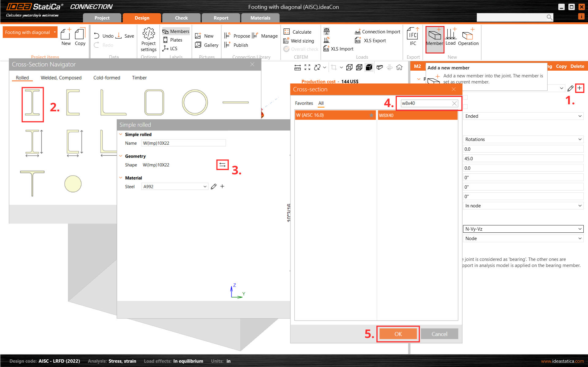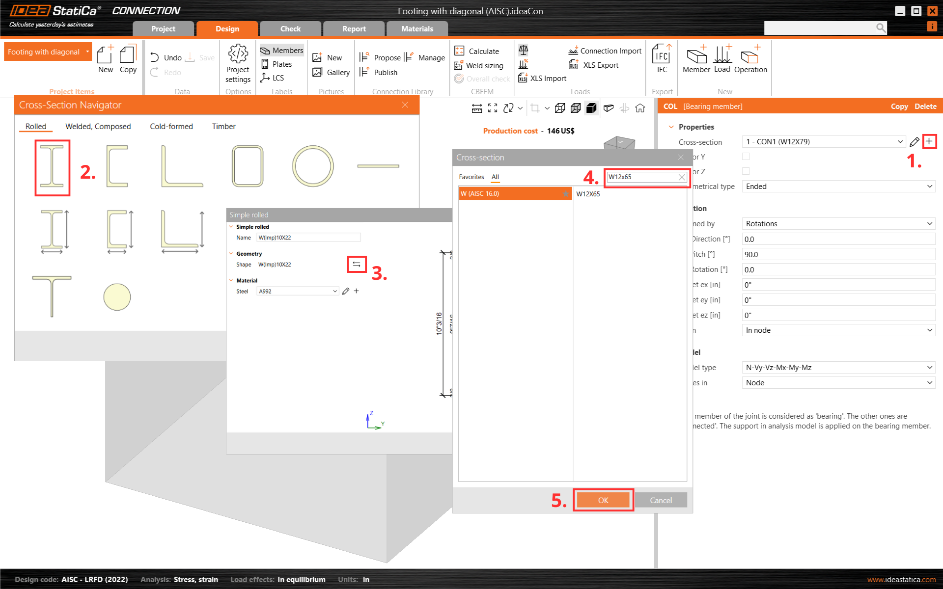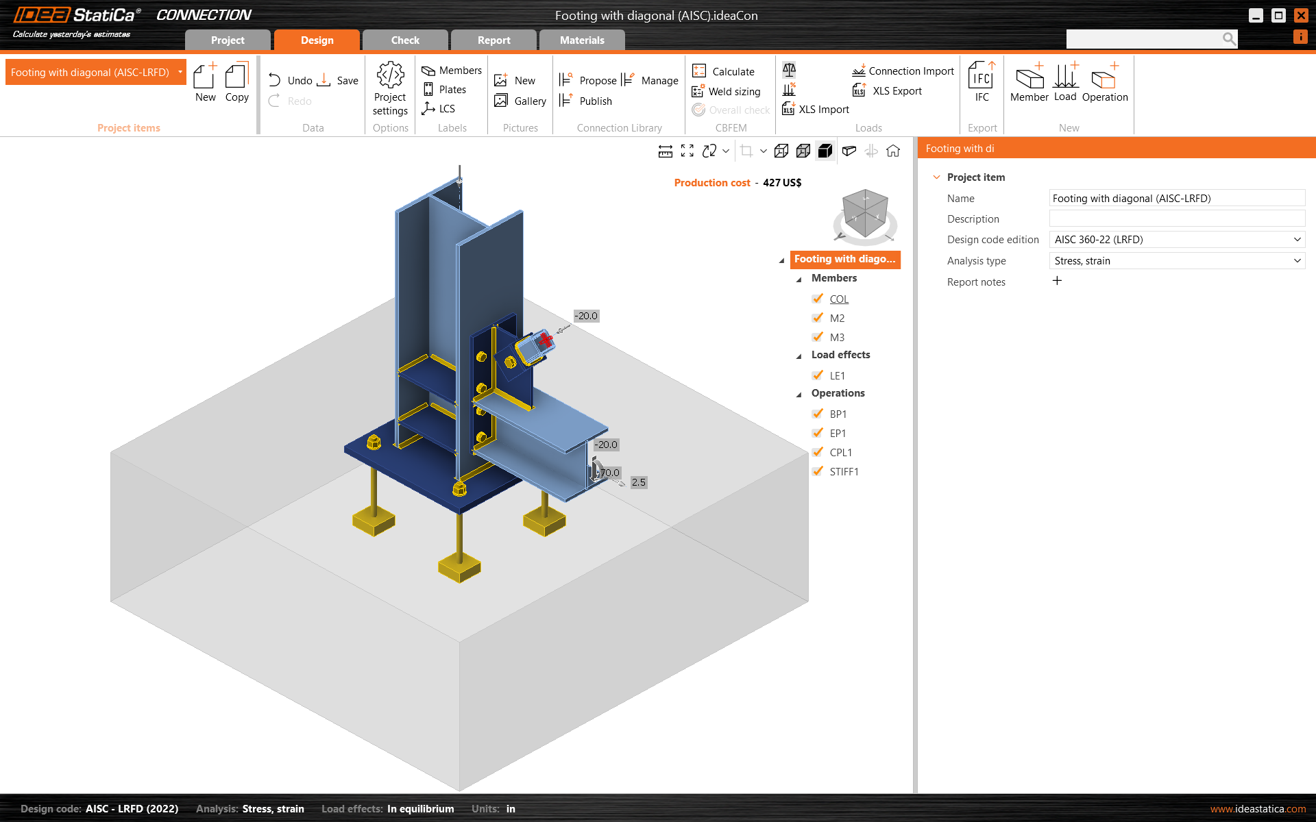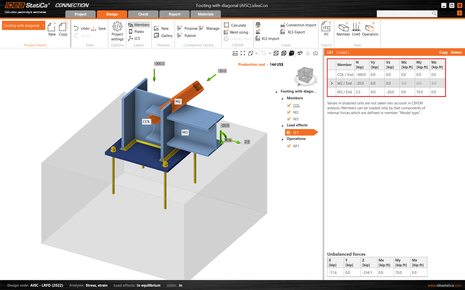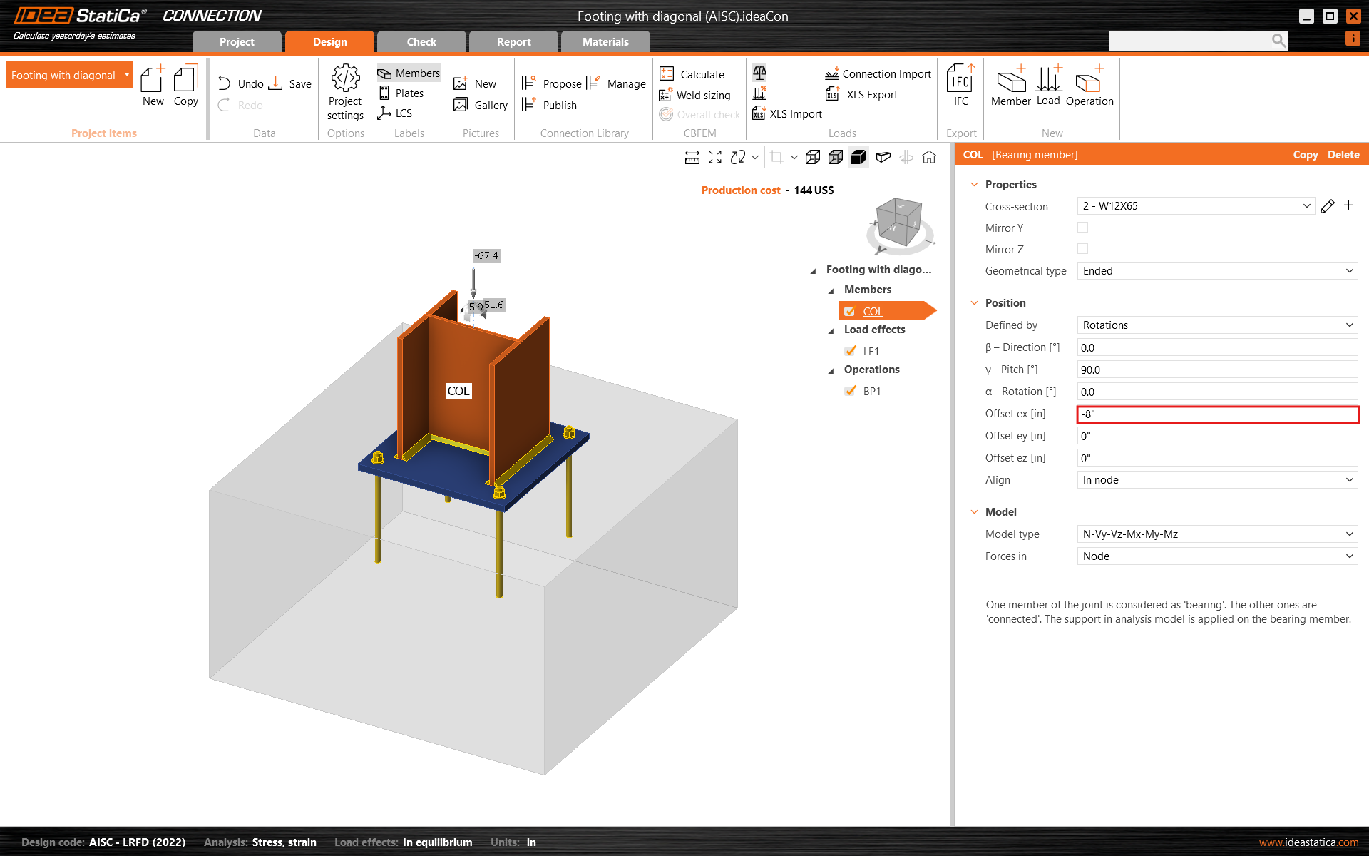 Un effet de charge a été ajouté automatiquement. Saisissez les valeurs des efforts internes à la table et sélectionnez norme LRFD. Autres cas de charge seront ajoutés.