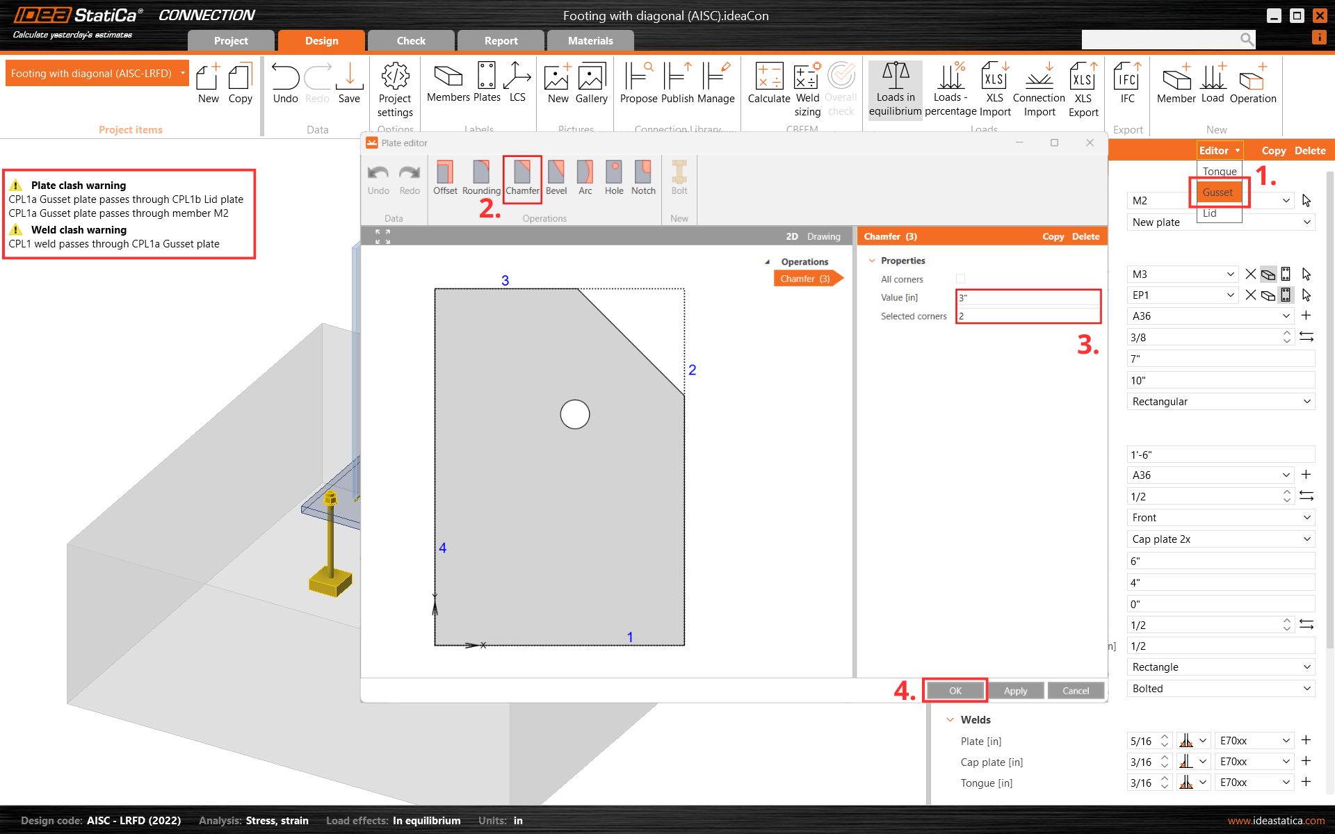 Ensuite coupez un coin de la platine de raccordement CPL1. Pour faire ça, allez à Éditeur - Gousset et créez un Chanfrein au coin numéro 2.