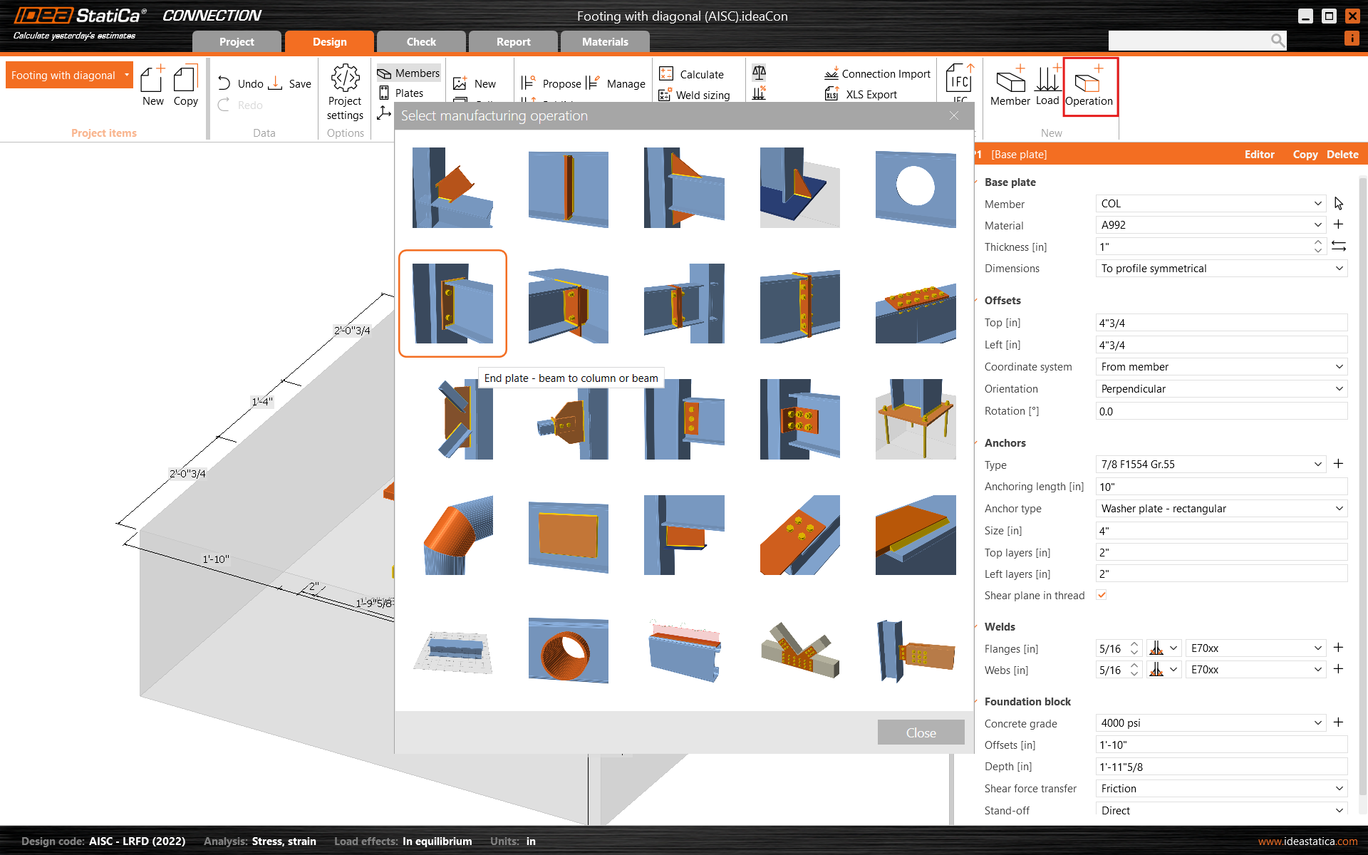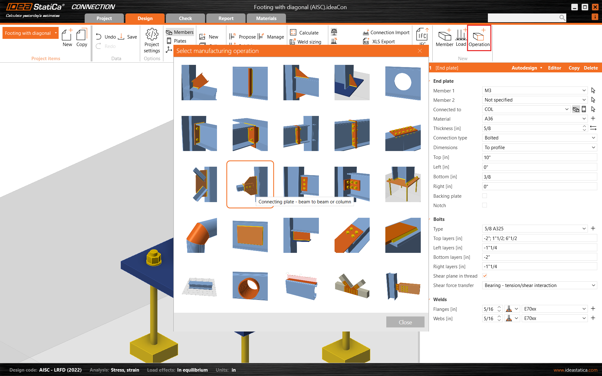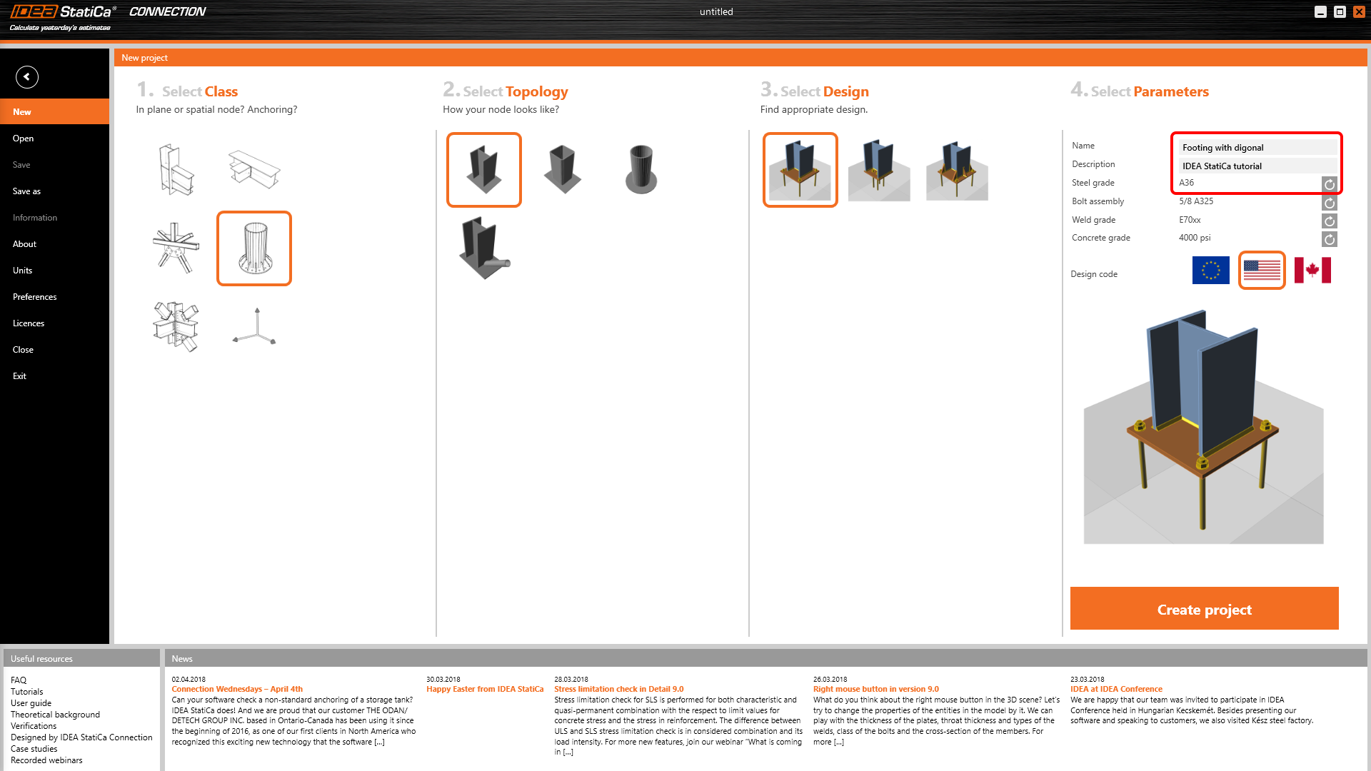 Démarrez IDEA StatiCa et sélectionnez l'application Connection. Créez un nouveau projet en sélectionnant le modèle qui est le plus proche à votre conception souhaitée, nommez-le et choisissez la norme et caractéristiques de matériau par défaut – A36.