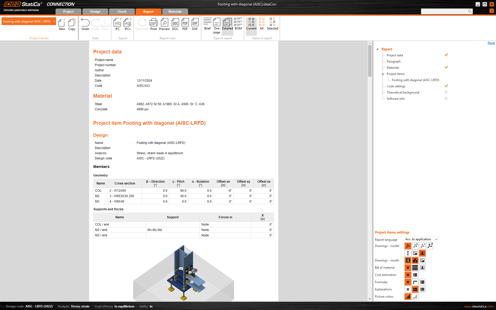 Enfin, allez à l'onglet Rapport. IDEA StatiCa offre un rapport complètement personnalisable à imprimer ou enregistrer en format éditable.