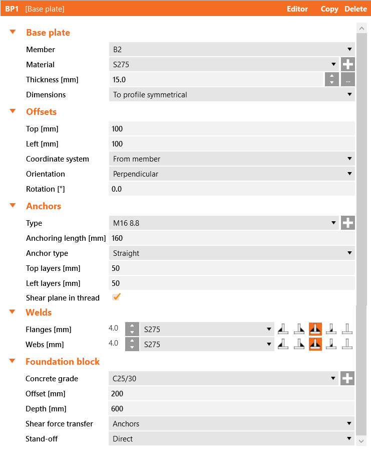 Appliquez l'opération pied de poteau avec les paramètres suivants :