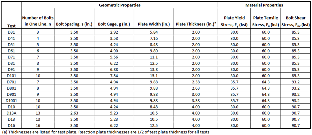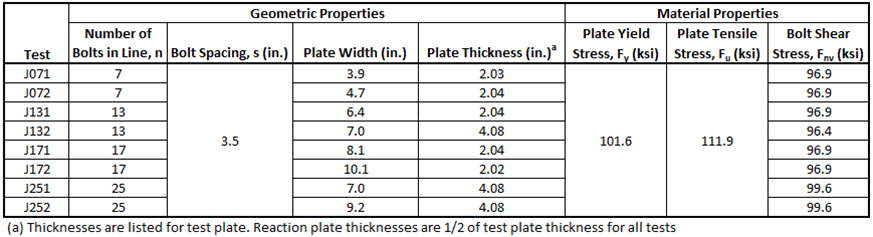 Table 3 Test specimen geometric and material properties for the Kulak and Fisher (1968) experimental investigation