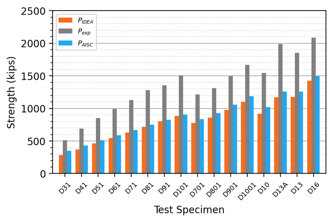 The sixteen specimens were modeled in IDEA StatiCa. The strength of each connection was also computed according to traditional calculations using the AISC Specification equations with measured material and geometric properties but without resistance factors. The results of the comparison between the experimental strength, Pexp, IDEA StatiCa strength, PIDEA, and the AISC Specification strength, PAISC, are presented in Table 2 and Figure 5.