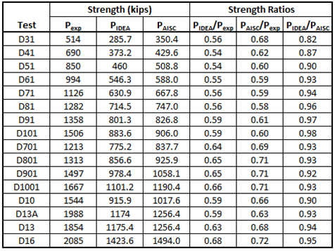 - Strengths from IDEA StatiCa were found to be conservative in comparison to physical experiments performed by Bendigo et al. (1963) and Kulak and Fisher (1968).