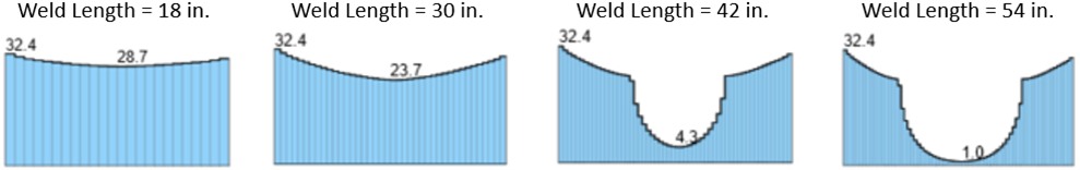 For Connection A, fourteen weld lengths were tested, increasing in 4 in. increments between 10 in. and 62 in. For Connection B, thirteen weld lengths were tested, increasing in 10 in. increments between 10 in. and 130 in. A comparison of strength vs. weld length is presented in Figure 9 for Connection A and Figure 11 for Connection B. Stress distributions along the length of the weld are presented for varying weld lengths in Figure 10 for Connection A and Figure 12 for Connection B.