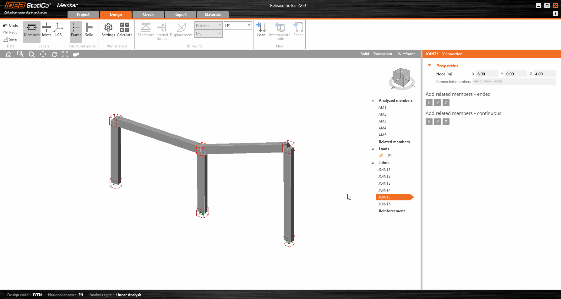 - Work with the well-organized model. In the previous versions, you had to click further to the properties of the member to get to know the name of the joint and its boundary conditions and it all took you precious time. With the new version, the joints are displayed with the cube around that is highlighted when the joint is selected, either in the navigation tree on in the 3D scene. By clicking on Joints in the ribbon the labels can be displayed, too.