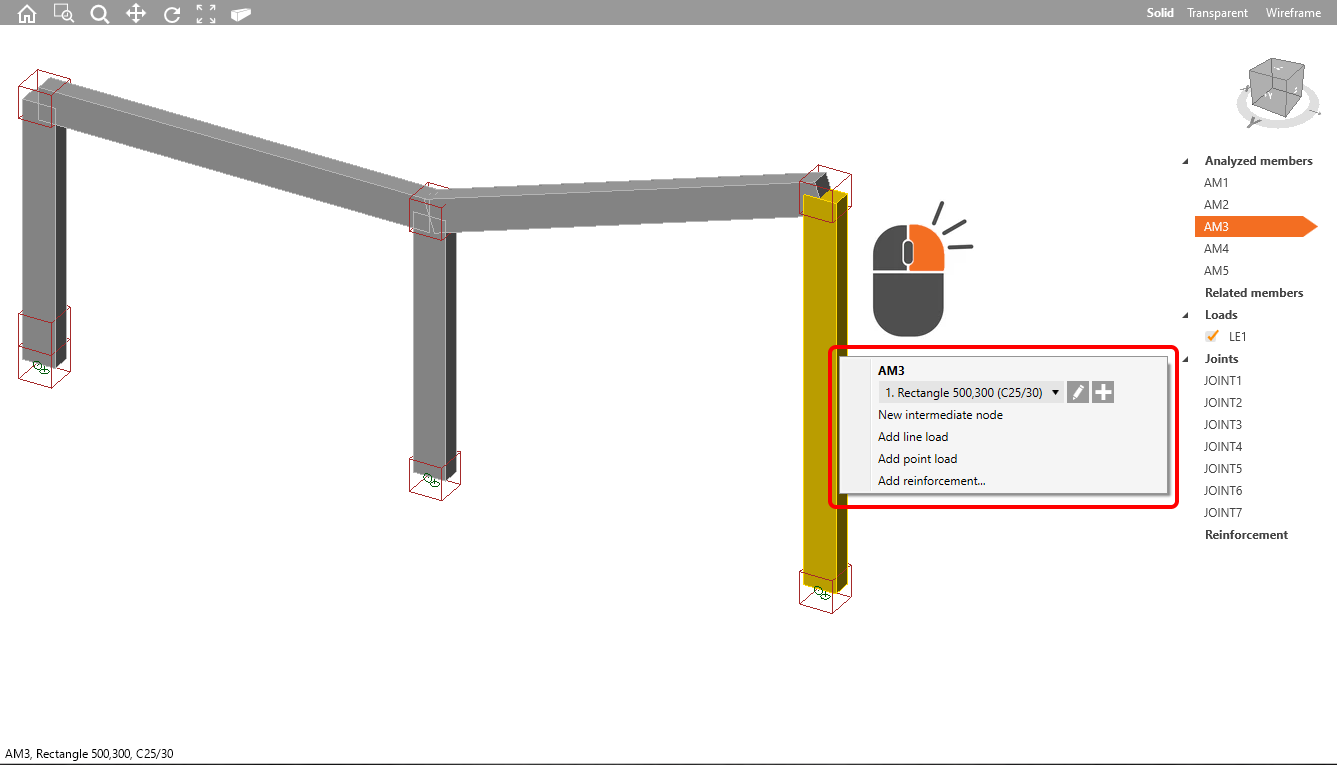 - Use the right-click button to run the context menu offering several speed functionalities, such as change of cross-section, adding of the intermediate joint, line load, point load, or running the reinforcement editor.
