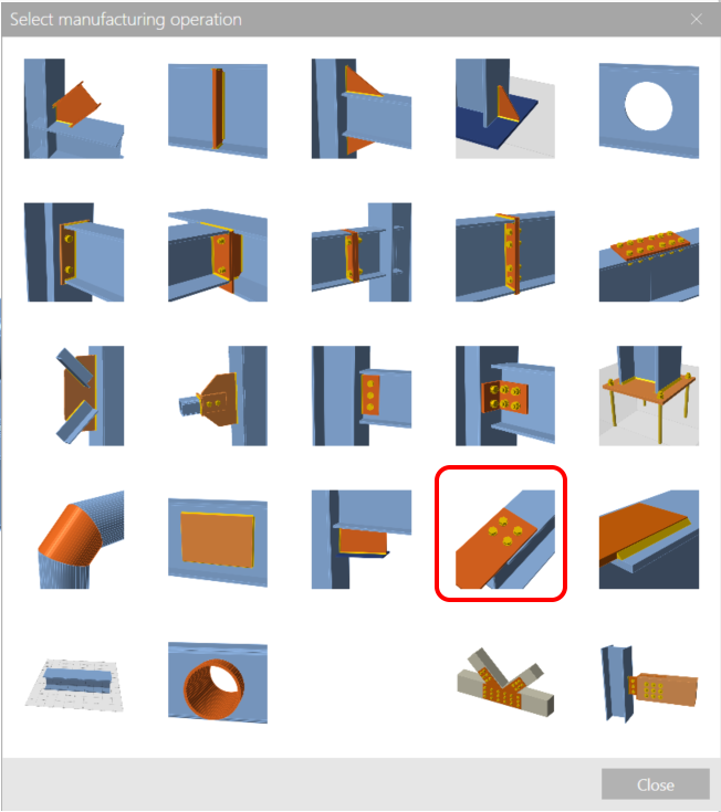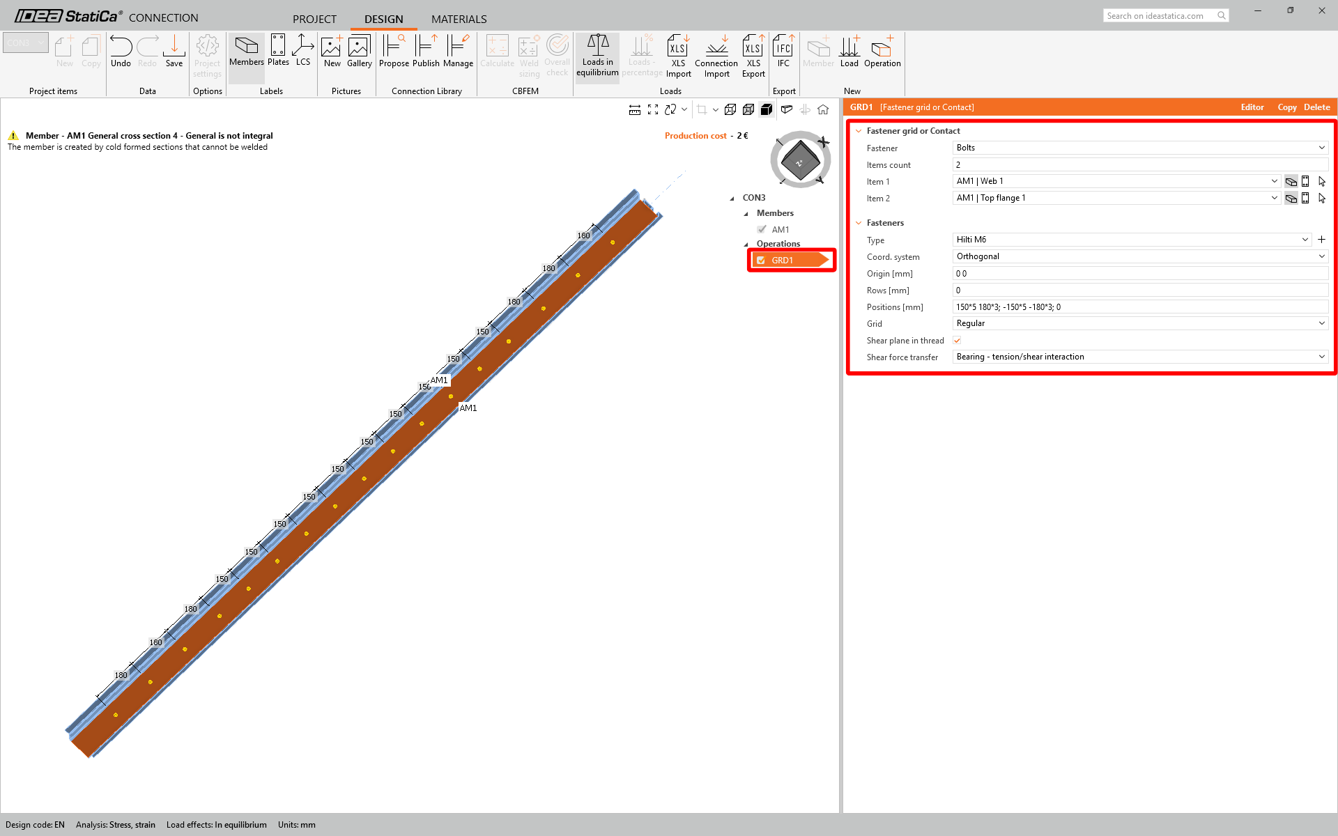 CON3 permet à l'utilisateur de créer un assemblage boulonné sur toute la longueur de la poutre. Choisissez la grille des moyens d'assemblage du fabricant ou l'opération Contact.