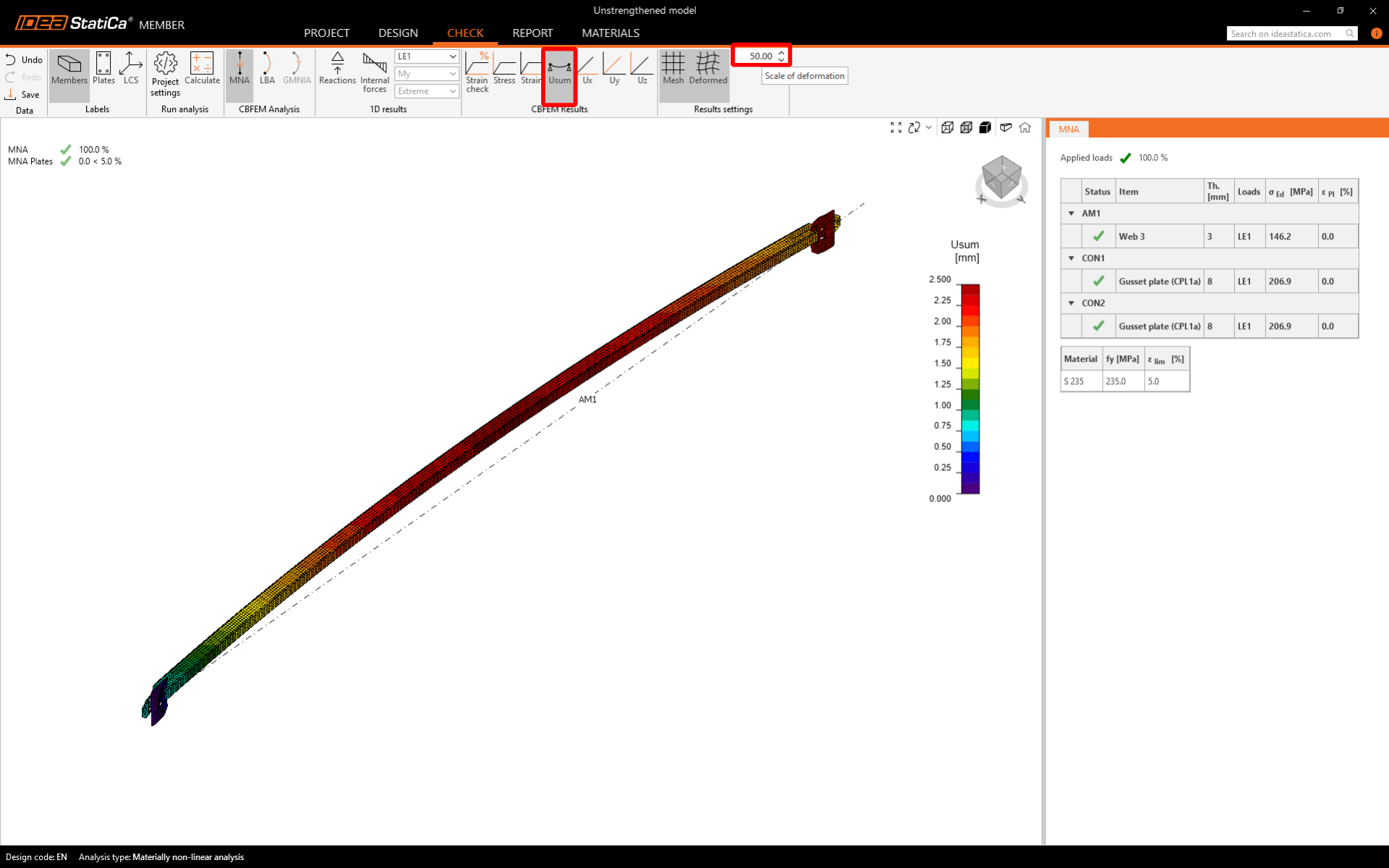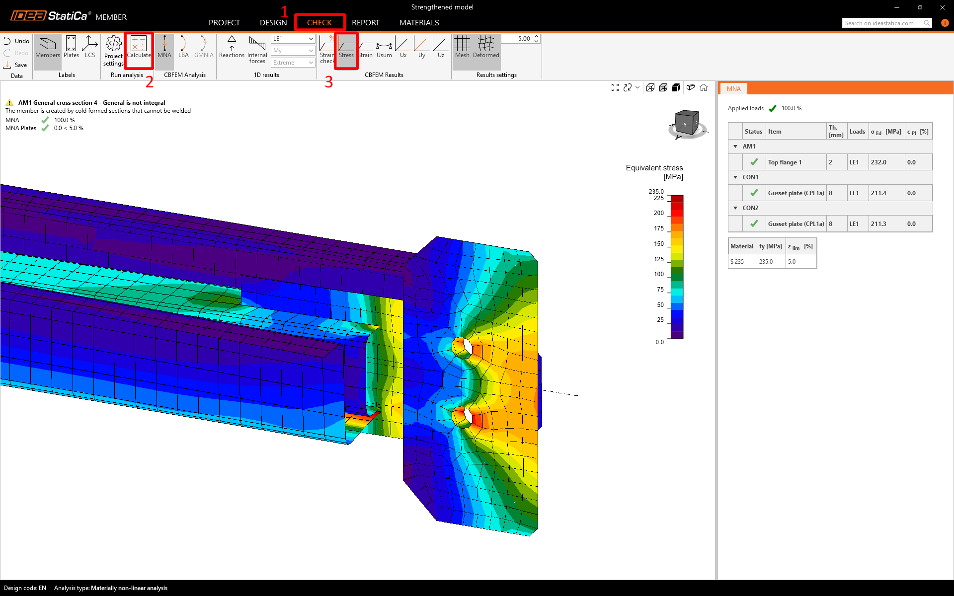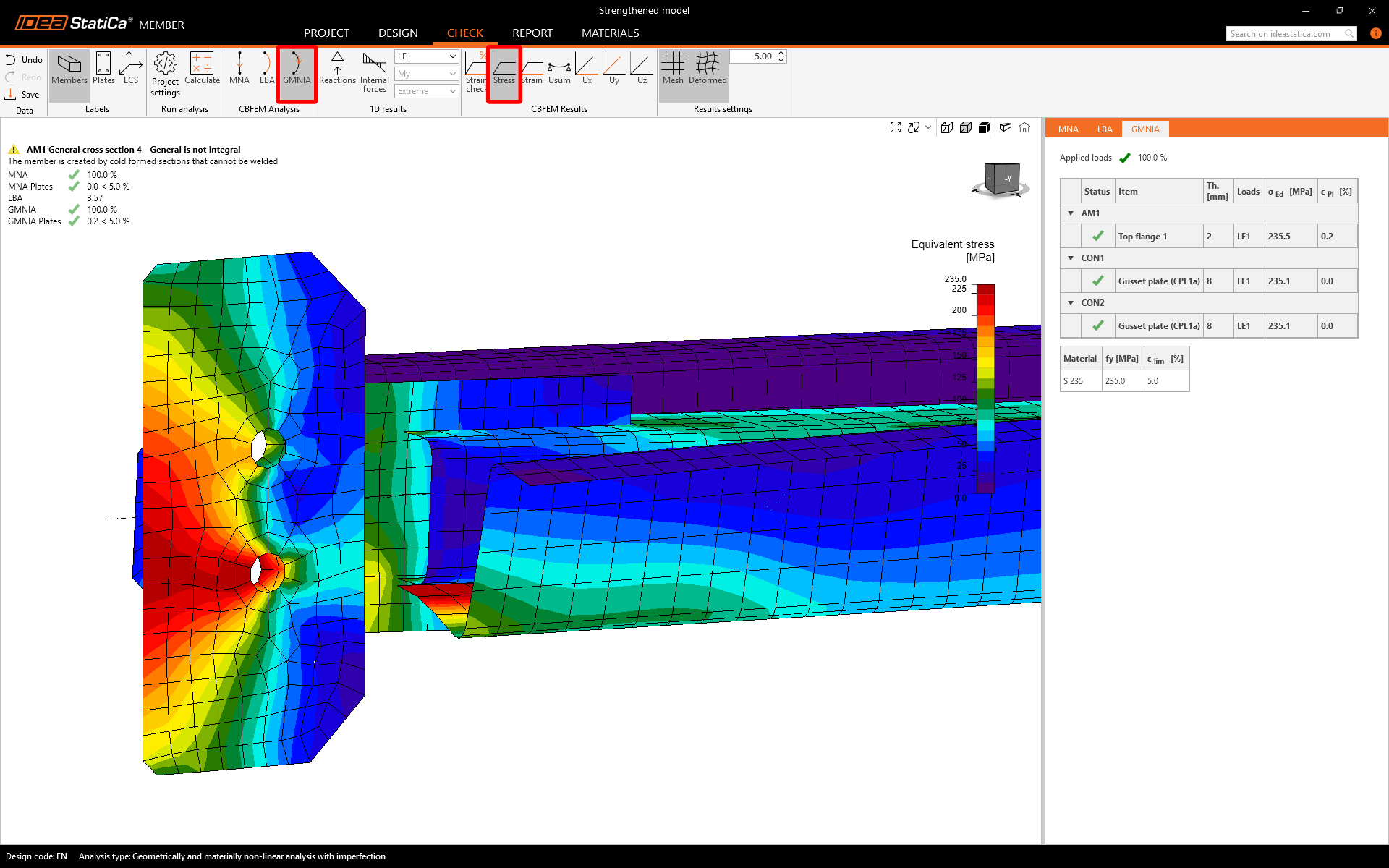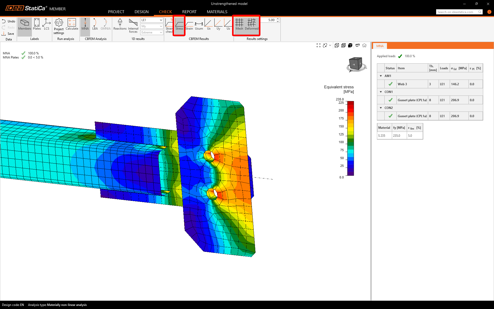 L'analyse non-linéaire matérielle (MNA) prend en compte la plasticité des matériaux et fournit des informations précieuses sur la contrainte équivalente et la déformation plastique du modèle. Cette analyse ne se concentre pas sur les vérifications de la norme des boulons et des soudures, car celles-ci auraient dû être vérifiées dans le modèle d'assemblage séparé.
