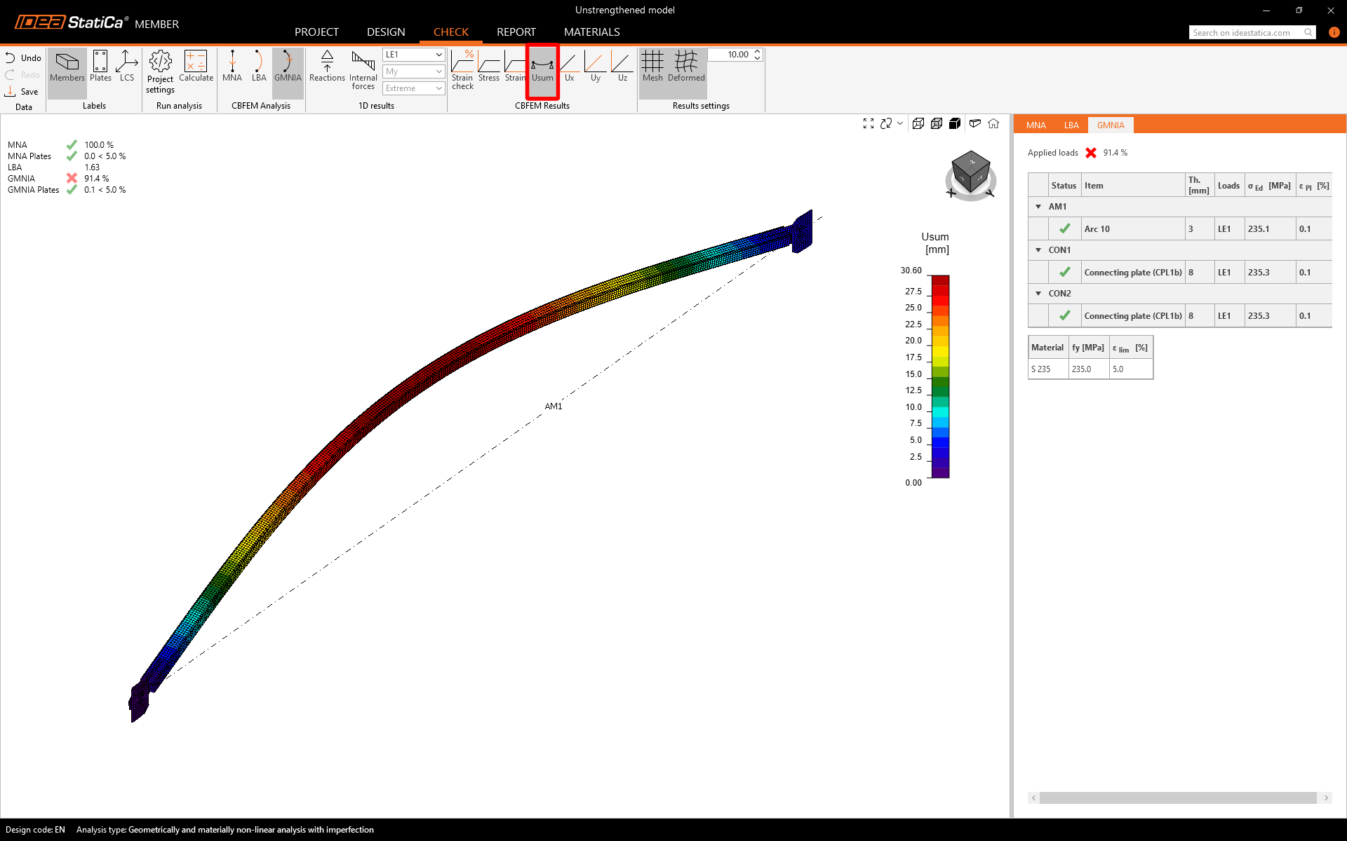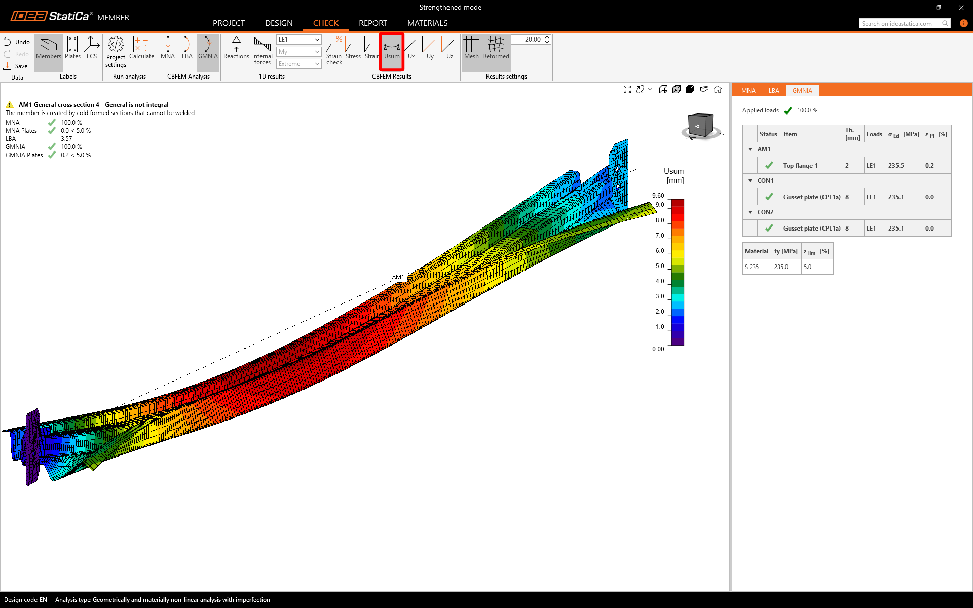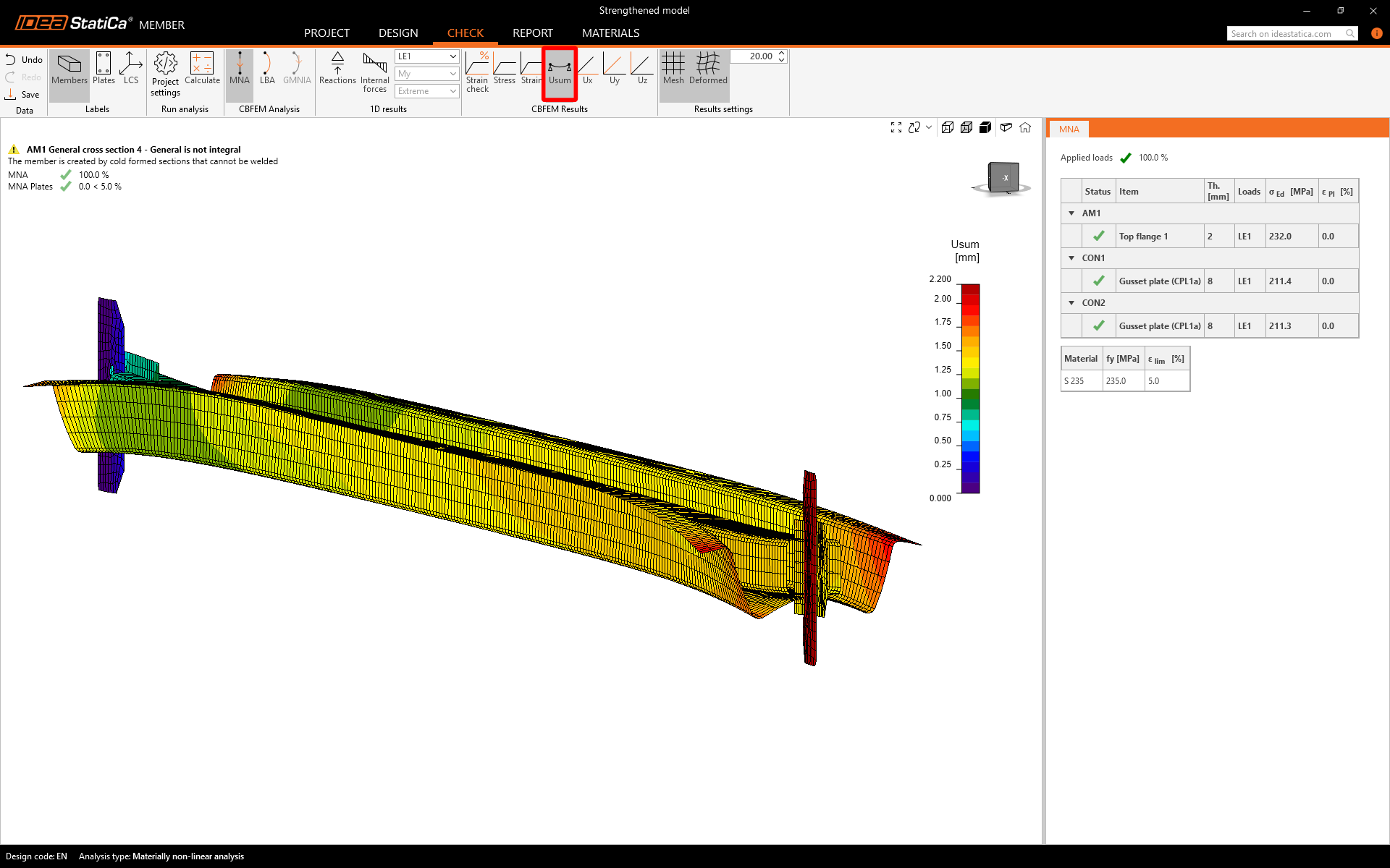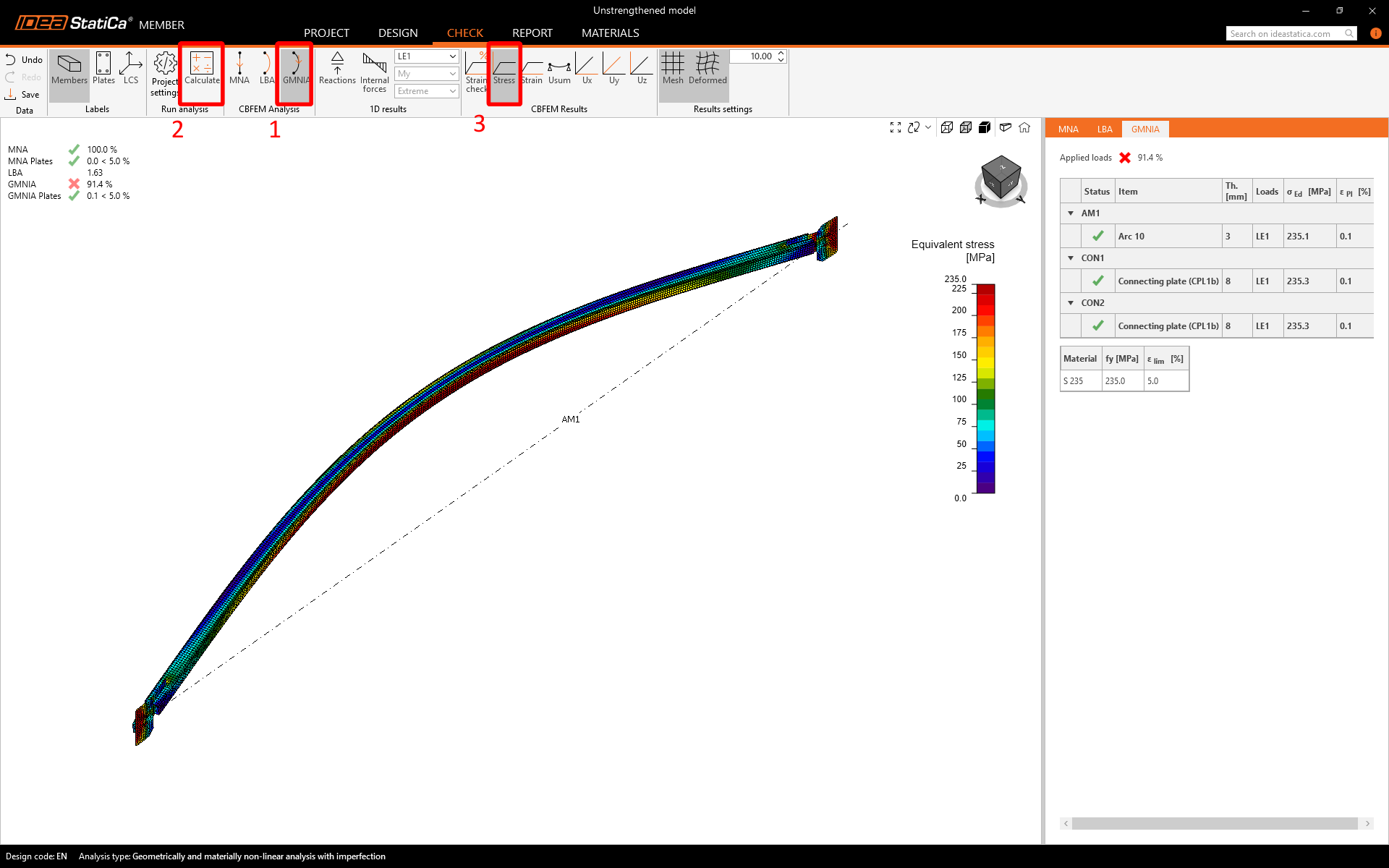 L'analyse non-linéaire matérielle (MNA) prend en compte la plasticité des matériaux et fournit des informations précieuses sur la contrainte équivalente et la déformation plastique du modèle. Cette analyse ne se concentre pas sur les vérifications de la norme des boulons et des soudures, car celles-ci auraient dû être vérifiées dans le modèle d'assemblage séparé.