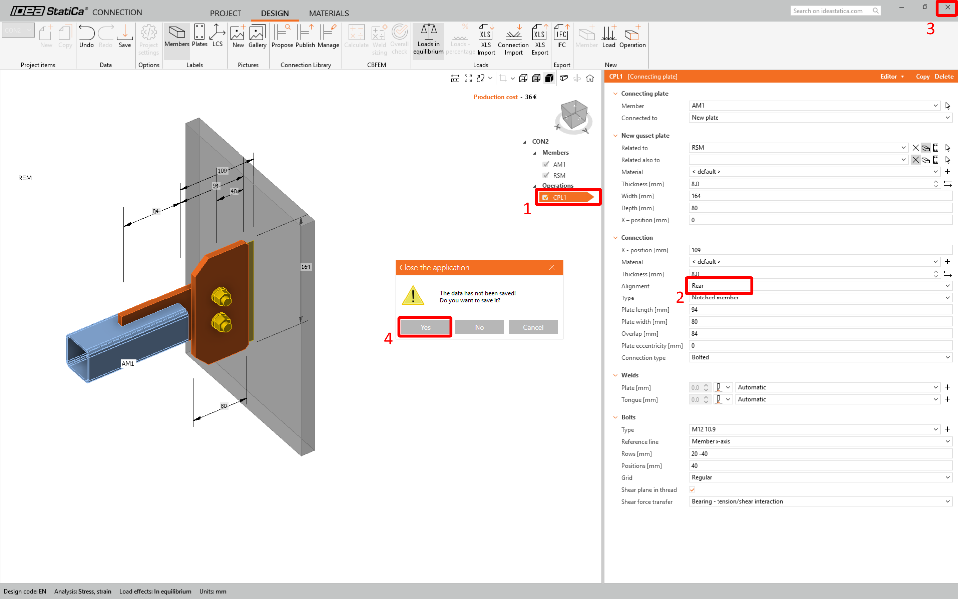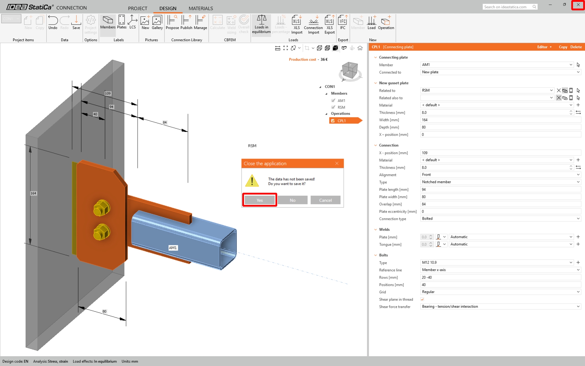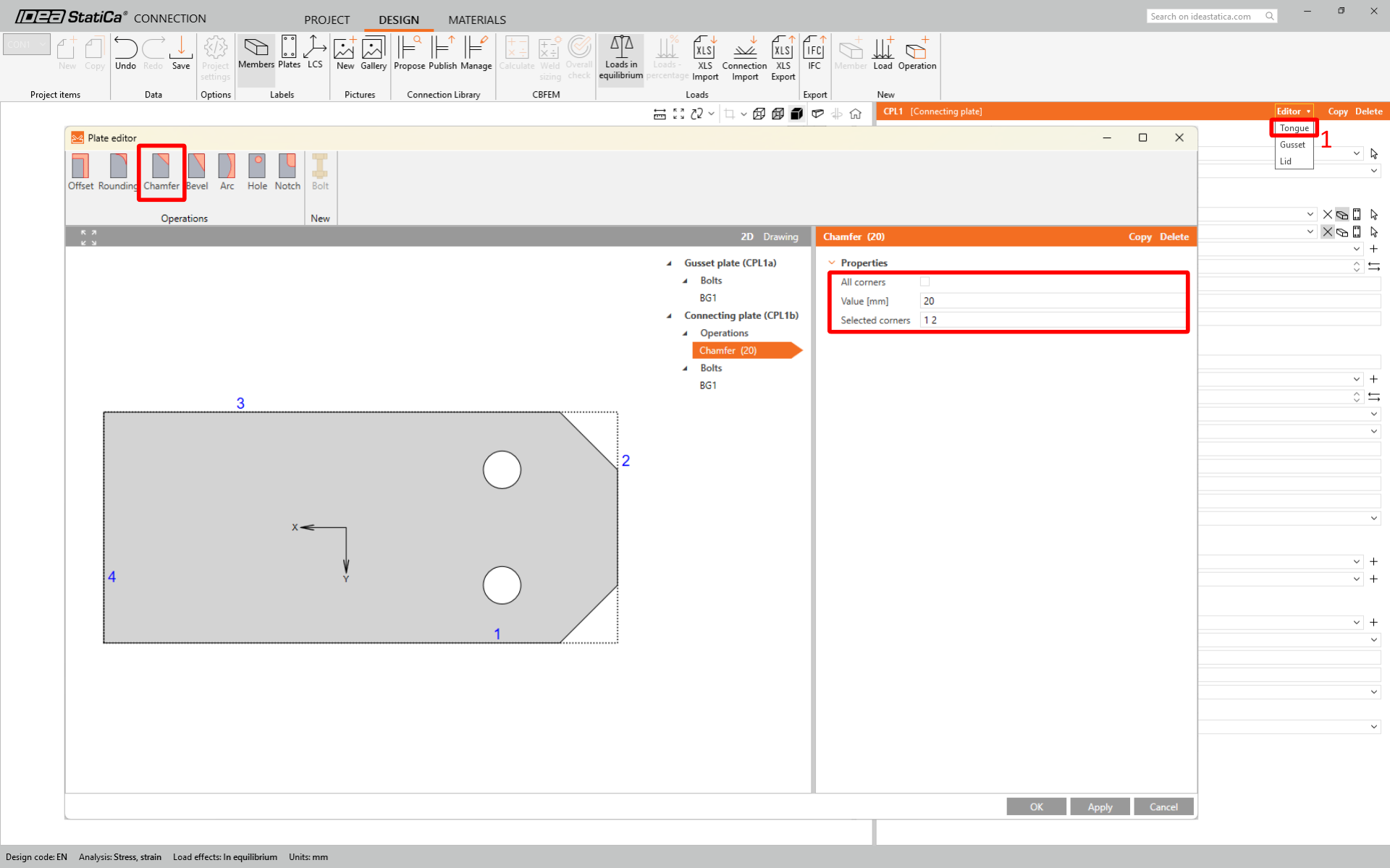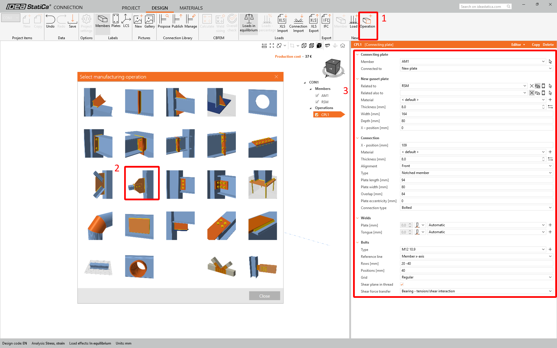La fenêtre IDEA StatiCa Connection s'ouvrira dans quelques secondes. Construisez l'assemblage étape par étape en ajoutant l'opération requise. Ajoutez l'opération de fabrication Platine de raccordement CPL1 et définissez ses paramètres comme indiqué dans la figure ci-dessous.