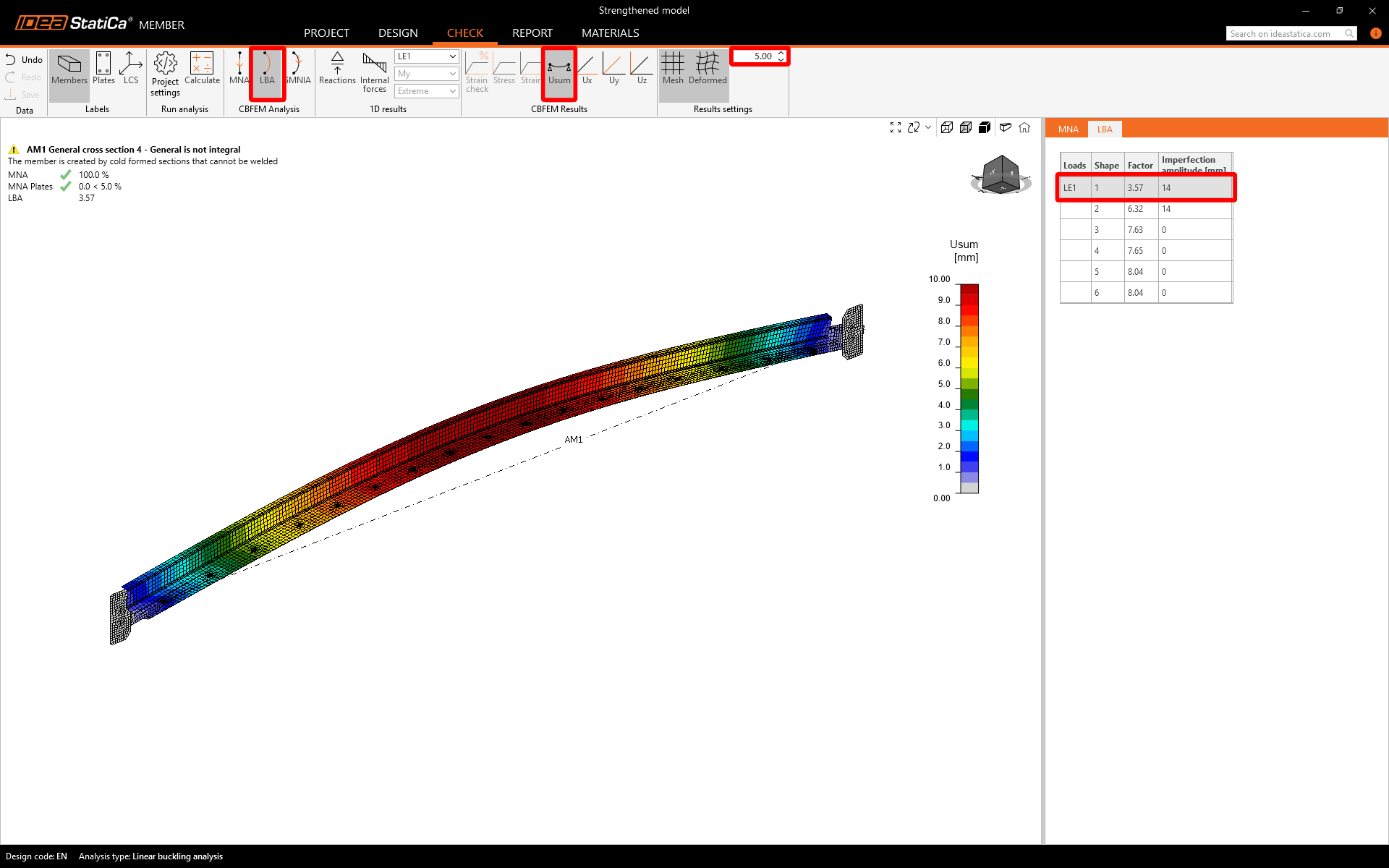 Lancez le calcul pour l'analyse de voilement linéaire. La première forme de voilement a changé en raison du renforcement de la section, il s'agit d'un mode de flexion pure dans la direction verticale. Le facteur de voilement a augmenté.