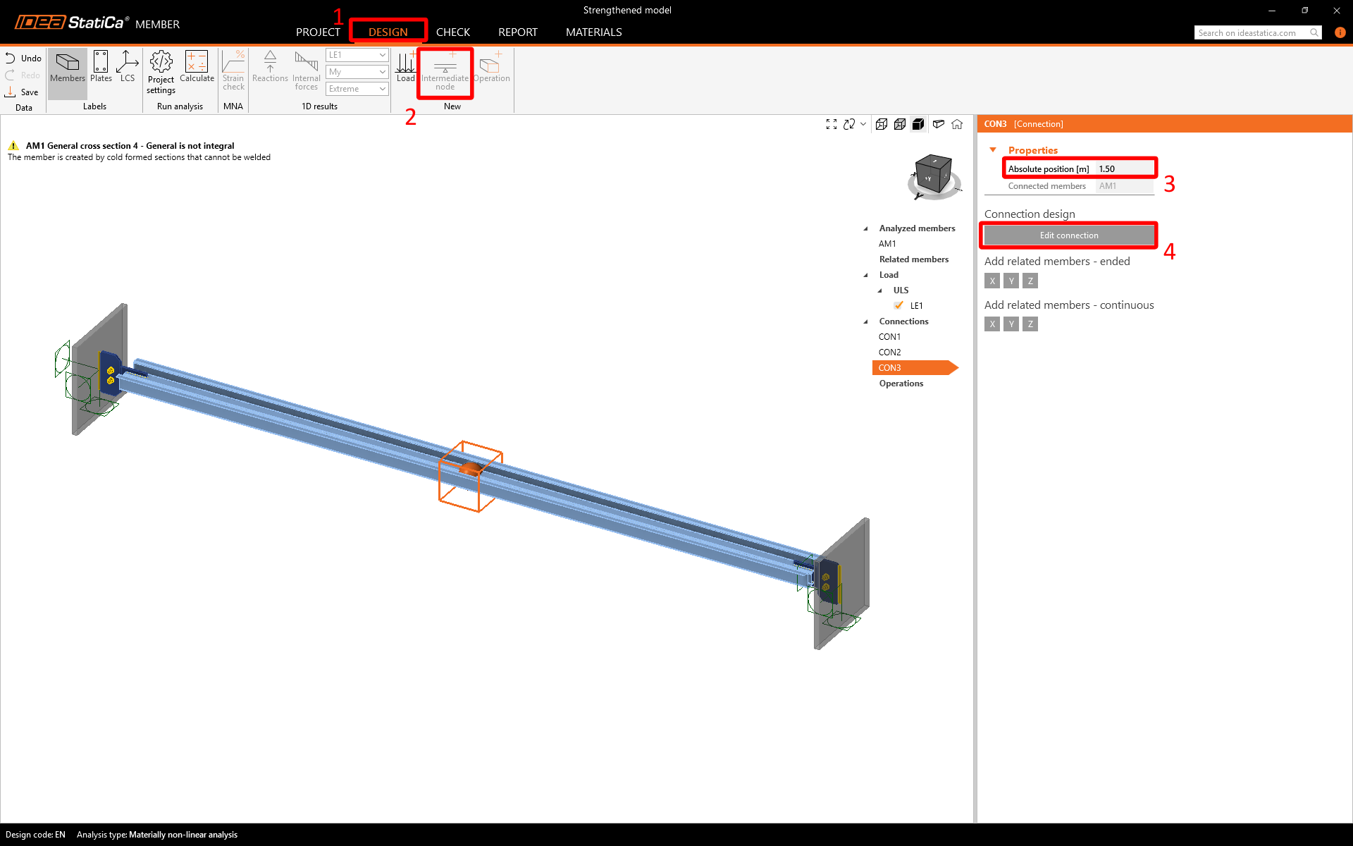 Ajoutez un nœud intermédiaire pour connecter les deux sections indépendantes avec des boulons, avec des positions absolues fixées à 1,5 m du début de l'élément. Éditez CON3.