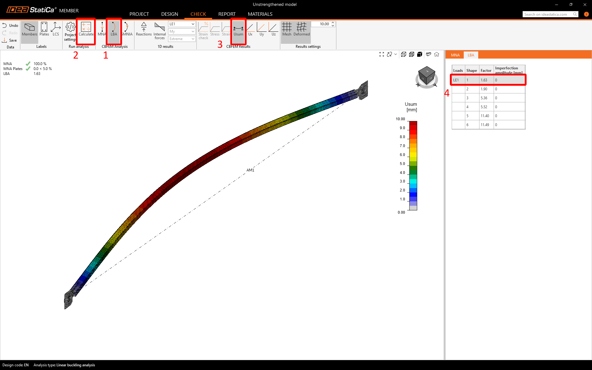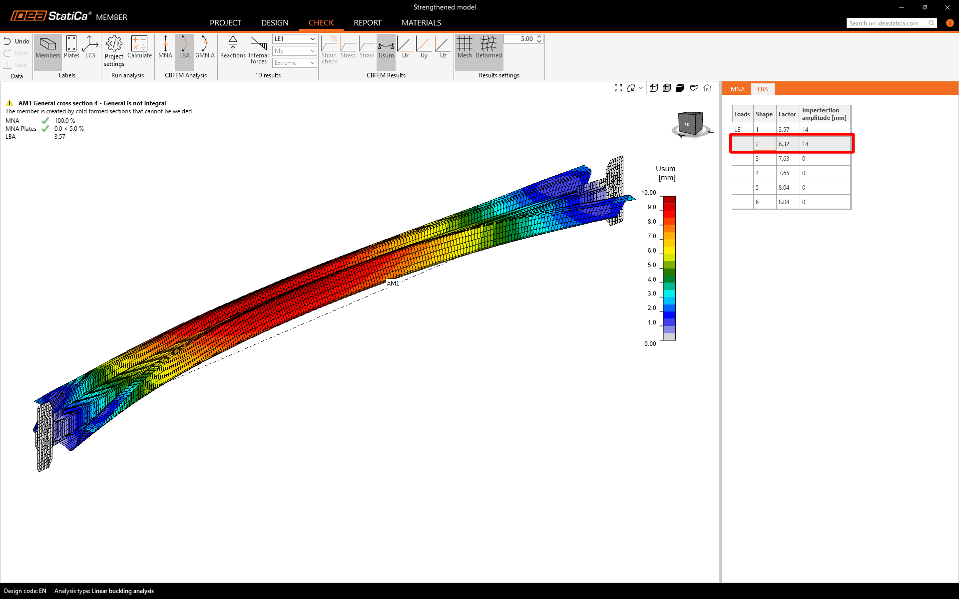 L'analyse de voilement linéaire (LBA) fournit plusieurs sorties cruciales. La première forme de voilement montre une faible perte de stabilité par un facteur de 1,63 x Ned. Cependant, la forme du second mode, en raison d'une section transversale orthogonale symétrique, atteint un facteur plus élevé de 1,90. Il est important de garder à l'esprit l'interaction mutuelle des modes dans l'analyse à venir.