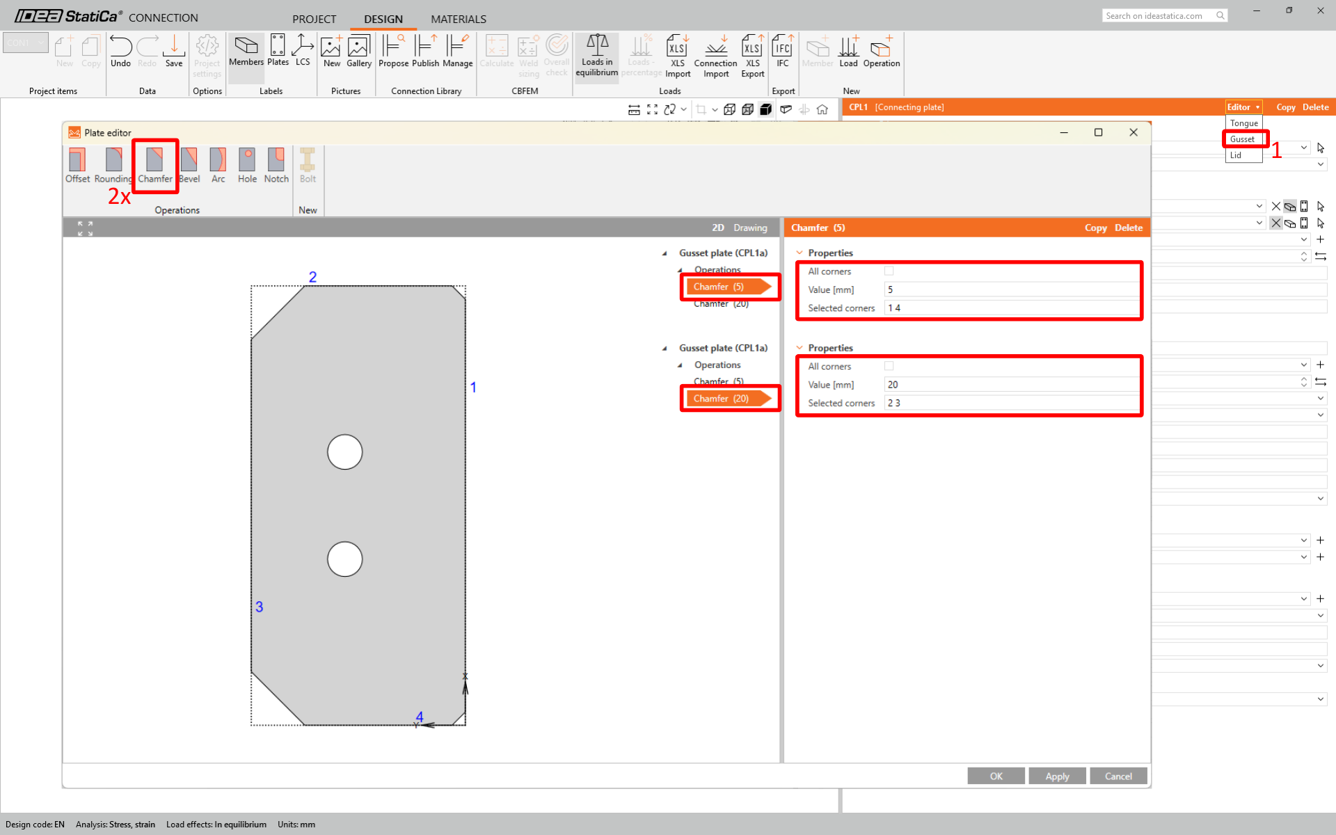 Dans l'étape suivante, ajustez la géométrie de la languette et du gousset dans l'éditeur des platines.