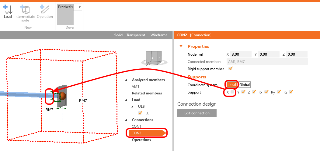 Relâchez l'appui dans la direction X locale pour CON2 en raison de la charge axiale prédéfinie dans l'onglet Charge.