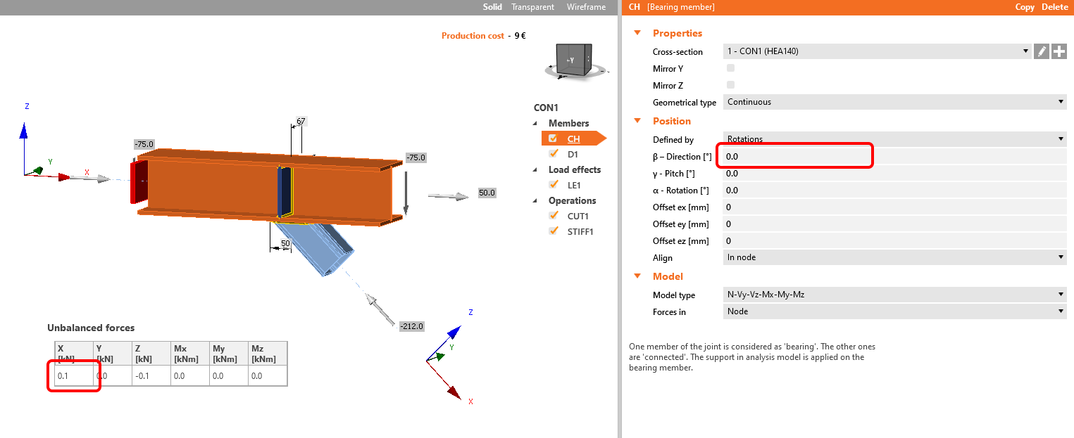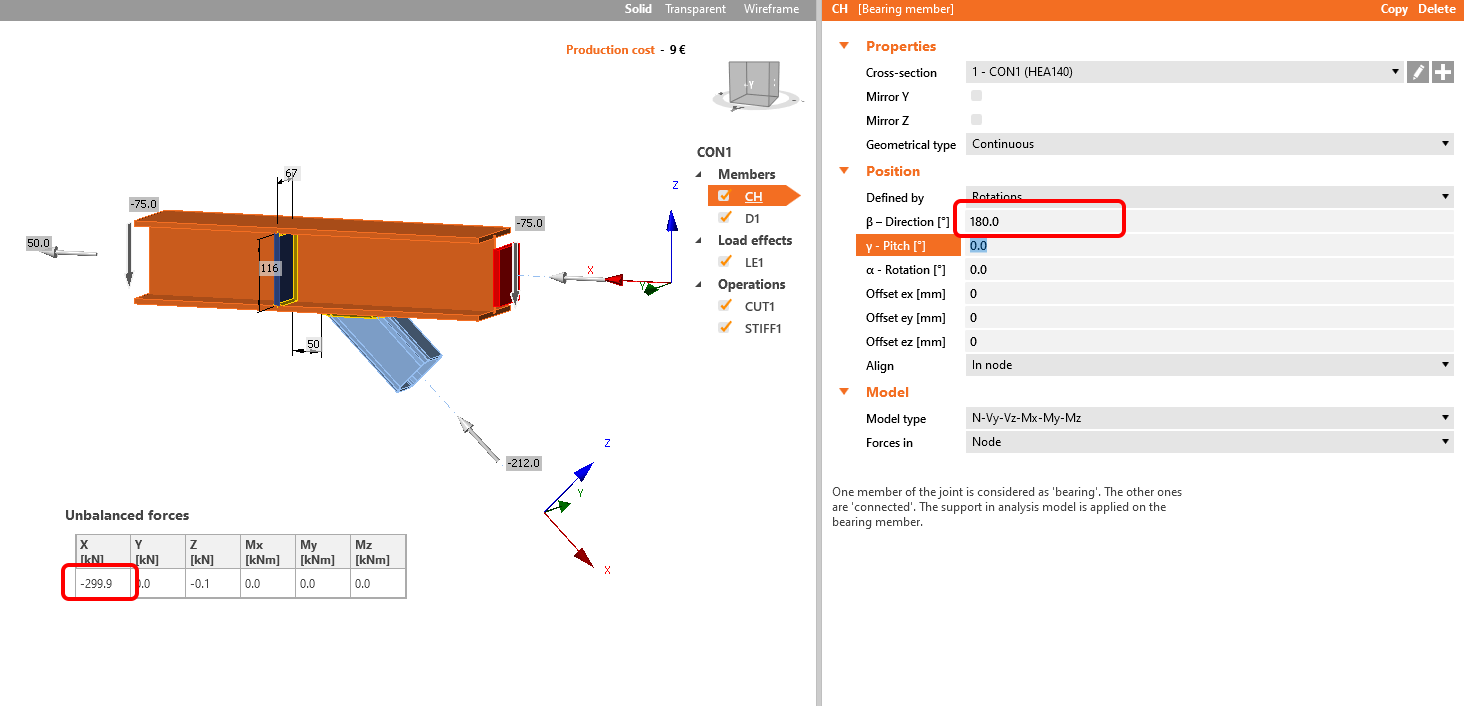 In the following example turning the member beta direction changes the direction of LCS and causes big differences in the joint. See the position of the stiffener and also check the unbalance forces.