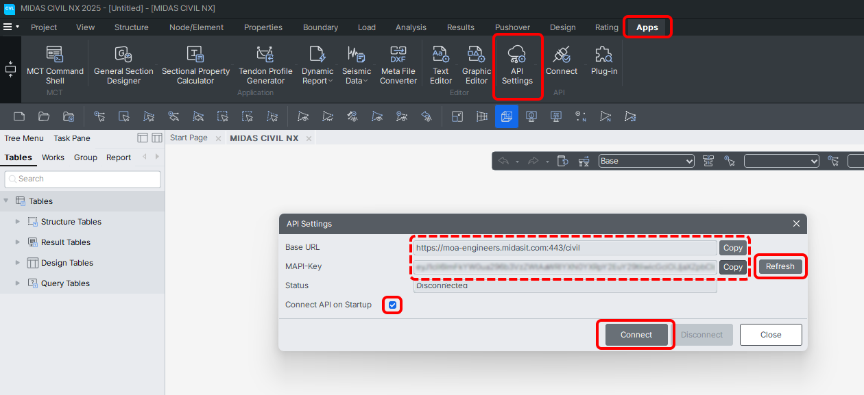 • Open your MIDAS CIVIL NX, go to the Apps tab, and open the API Settings. Here click Refresh to generate the MAPI-Key and enable Connect API on Startup.