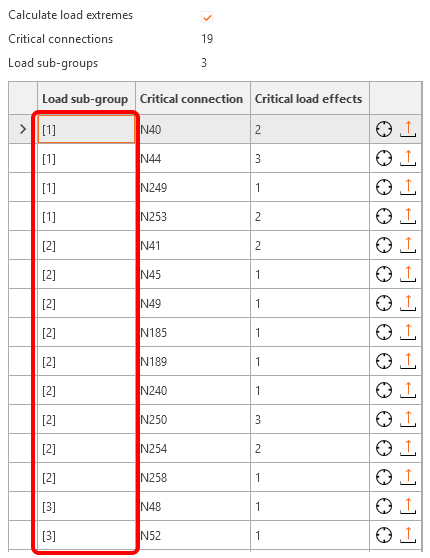 Then select the group and tick the Calculate load extremes combo box. This runs the algorithm, and a tab appears showing only connections containing the critical load effects.
