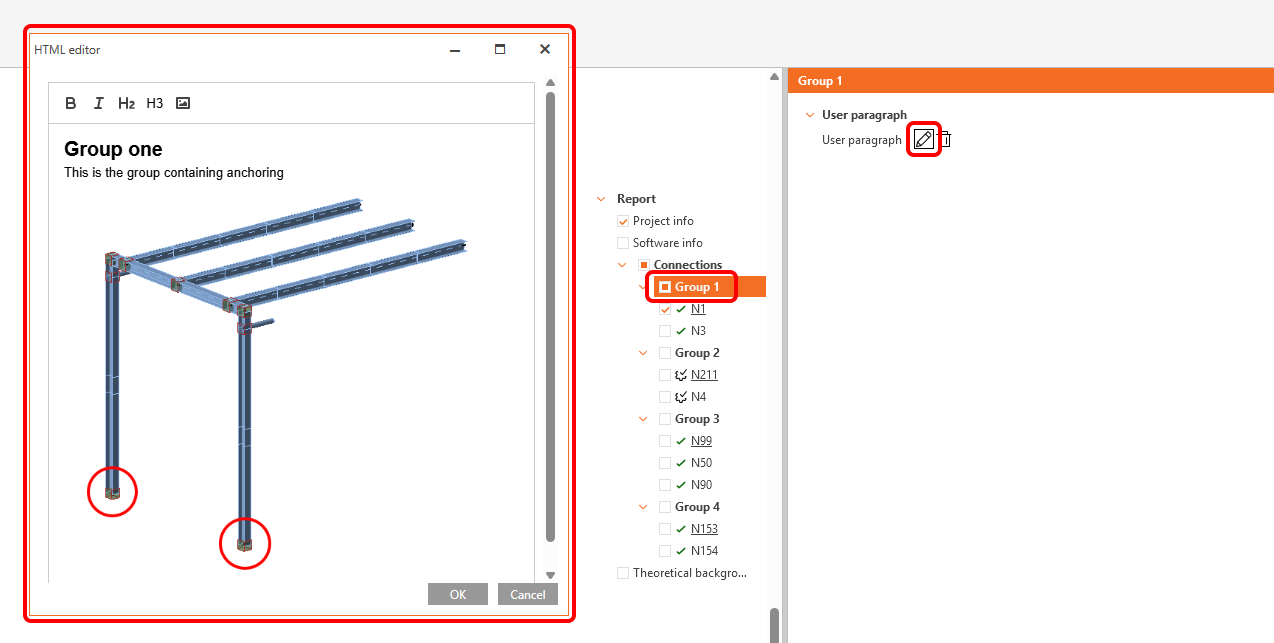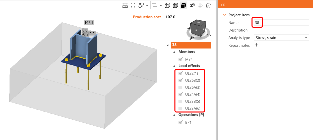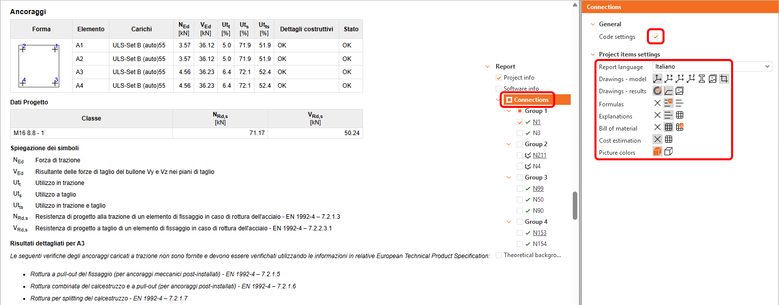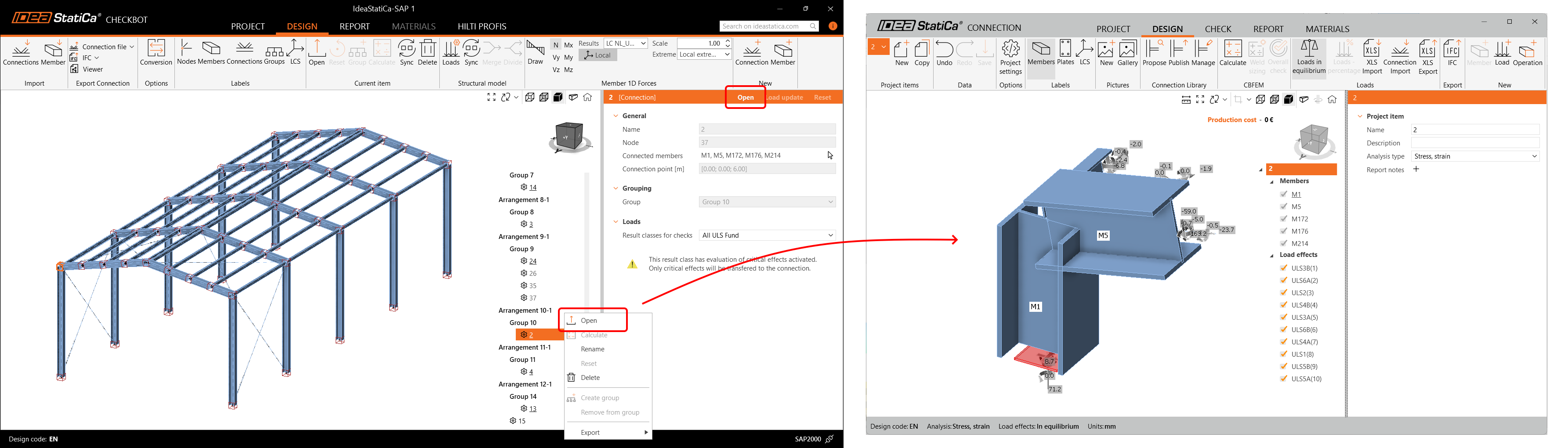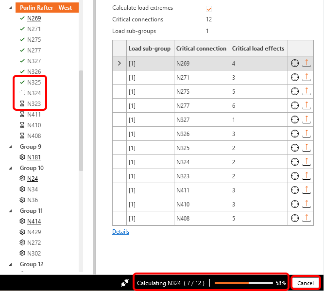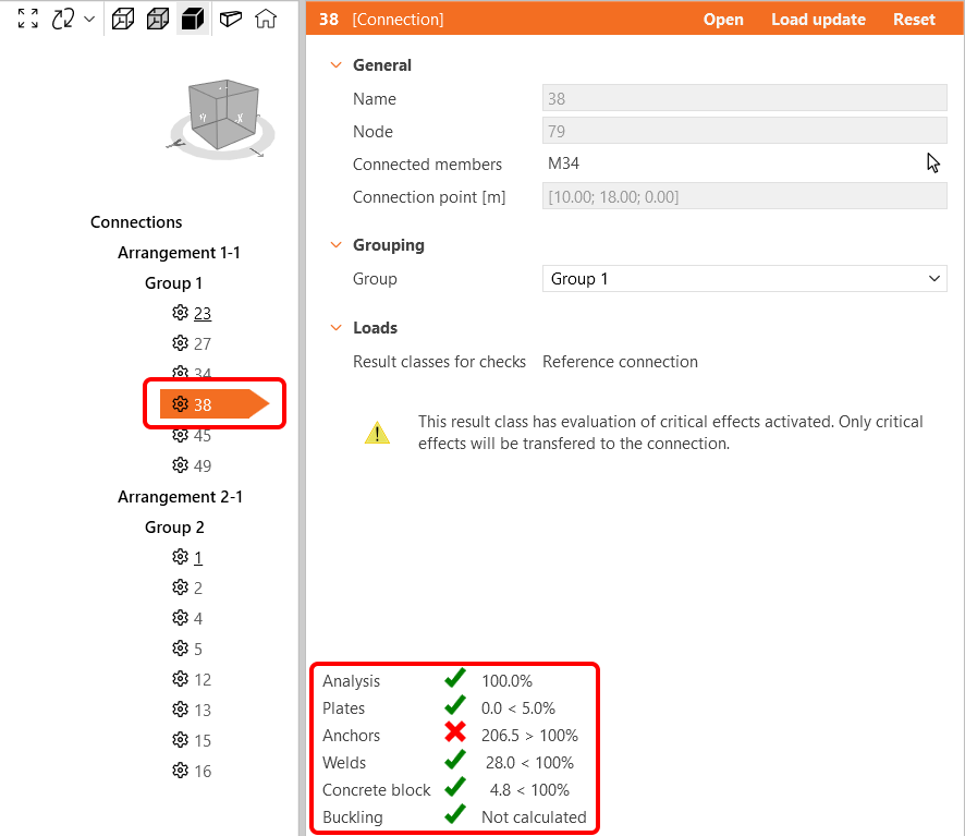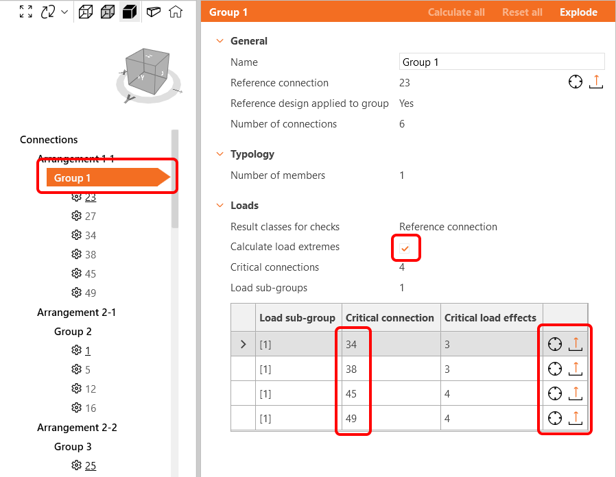 Calculate the group of connections and browse the results for critical load effects. Optimize the design of the reference connection or even reshuffle groups to finish with the best result.