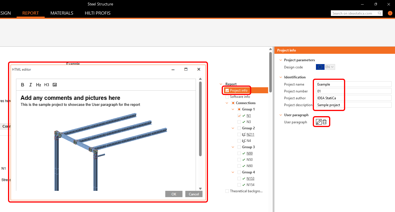• Add a User paragraph for the whole report, a text field and pictures at the beginning of the report.