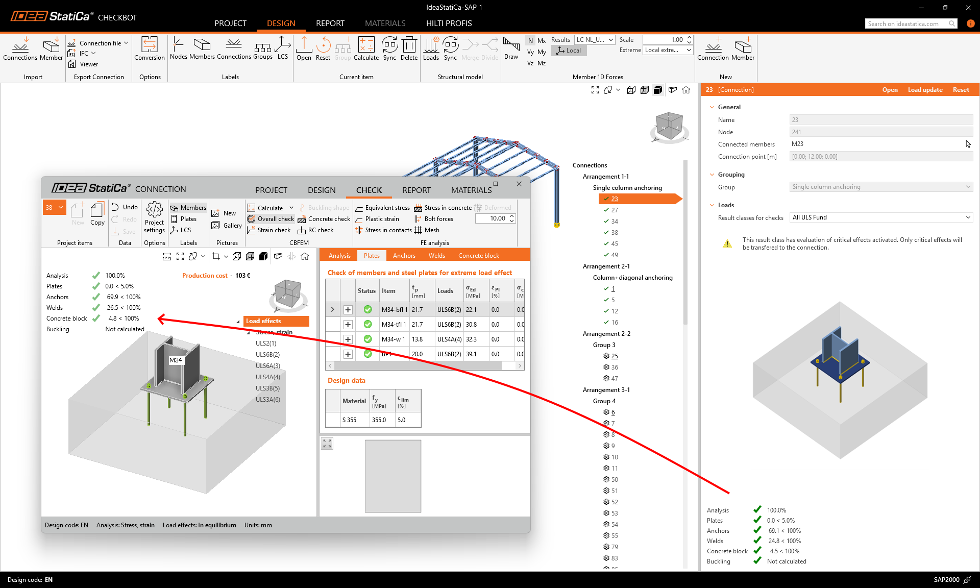 This function, together with the bulk group actions in Checkbot, enables users to design all connections in a project with minimal time. After that, users can deactivate the function and calculate all connections with all load effects as the final check.
