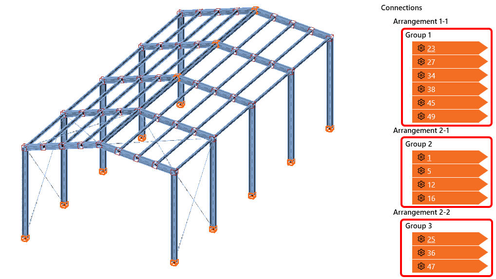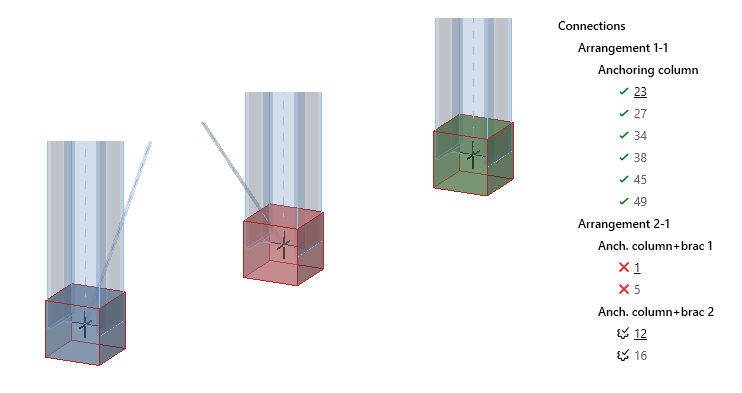 When the first bulk import of multiple nodes from the FEA global structural model into Checkbot is performed, nodes are sorted into Arrangements based on their geometry, and the Groups are created automatically. For each Group, a Reference connection is set.