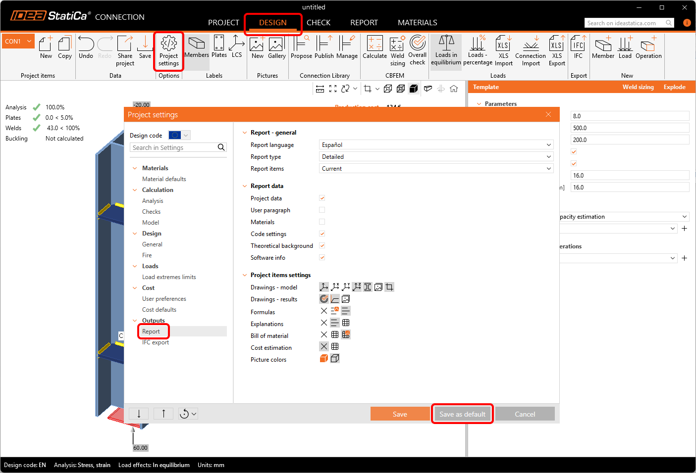 Alternatively, users can open the Project settings from the Design tab in the Connection app and save the report's current settings they are using in the current project as the defaults.