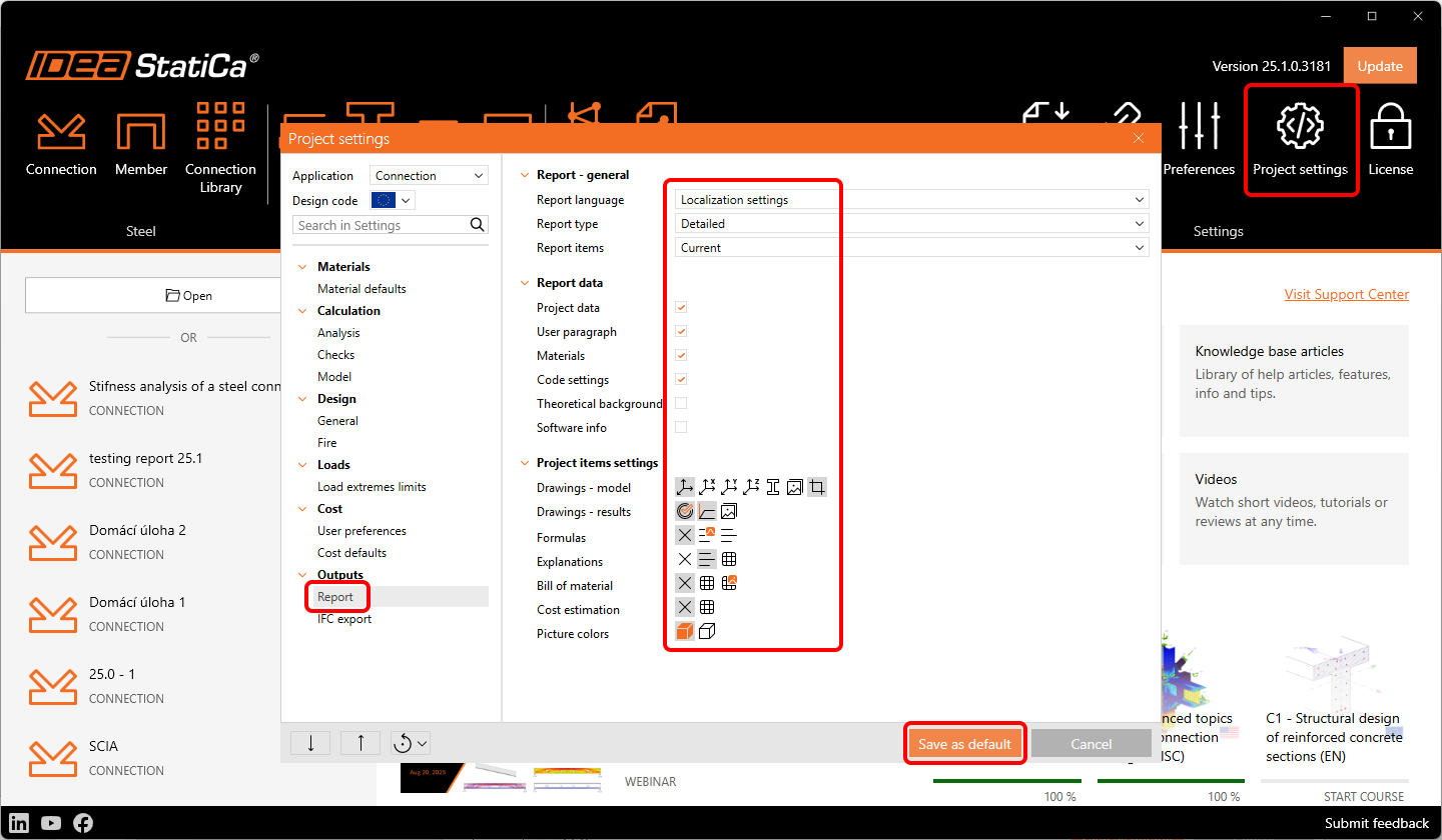 To change the report defaults, open the Project settings from the Launcher app, do the modifications and click Save as default.