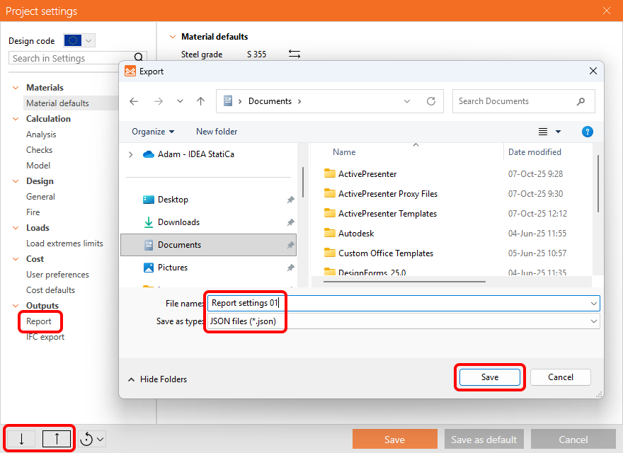 The report settings can also be exported from the Project settings to a JSON file using the Export command and shared with another user.