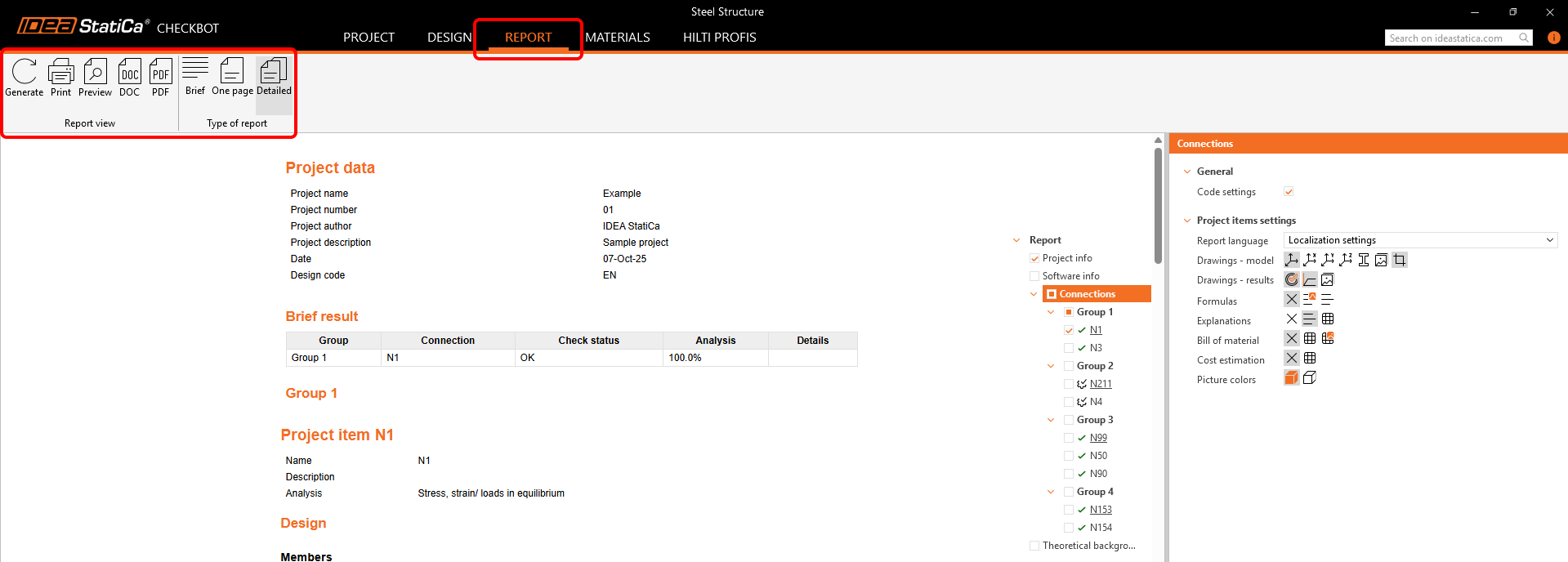 The Report tab is available in Checkbot in the same format as in the Connection app. The report can be generated for all connections in the project at once or for selected connections only and can be saved in PDF or DOC format for further editing or printed out directly.