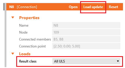 A Result class can be assigned to any given Design item using the drop-down menu in the project item properties. After a different Result class is selected, the Load update button can be used to generate Load effects for the project item based on the newly selected Result class. In case the project item has already been calculated, this action will delete the old results.