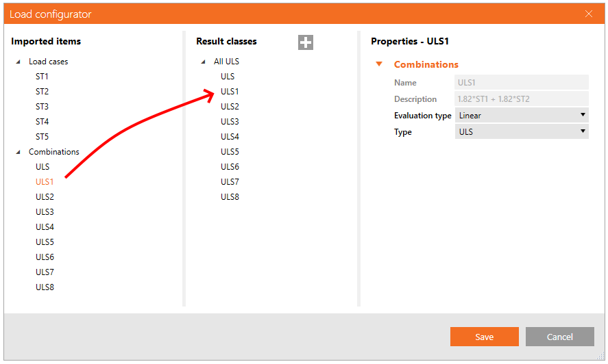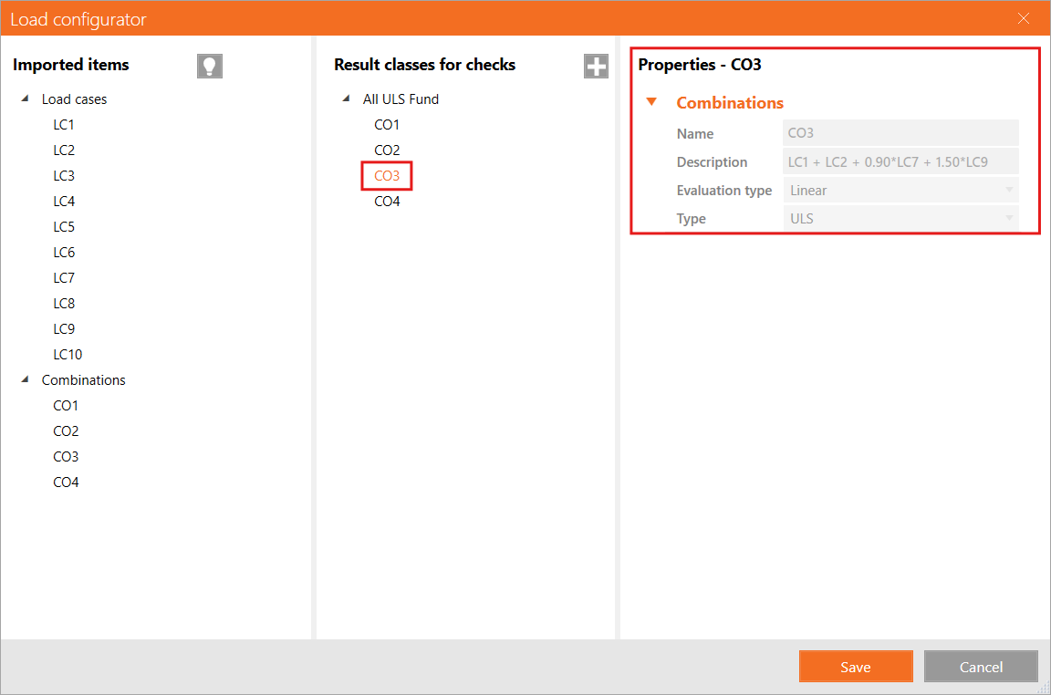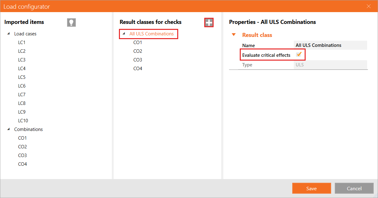 Imported load effects can be assigned to Result classes. Result classes are meant to sort load effects to specific groups, which can simplify and speed up the design process. Result classes can be created using the "+" icon and removed with a right-click.
