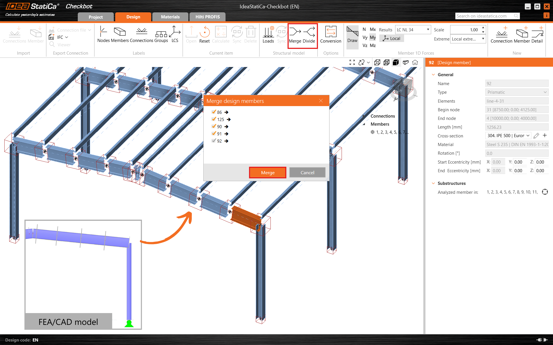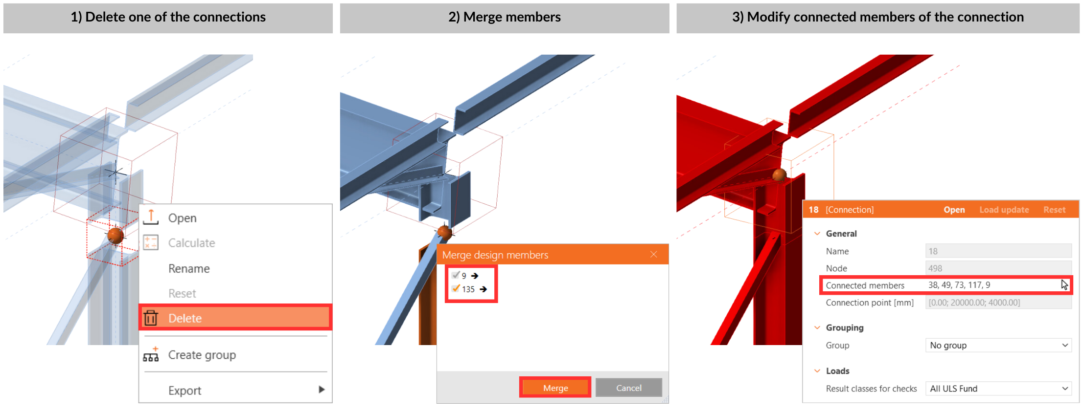 In some cases in the analysis software model, a member might be split into multiple members but in reality, it is one continuous member. For these cases, the Merge functionality can correct it. Right-click one of the split members you want to merge and tick other members that you want to connect. Please be aware, that only members aligned along the same X vector are able to be merged.