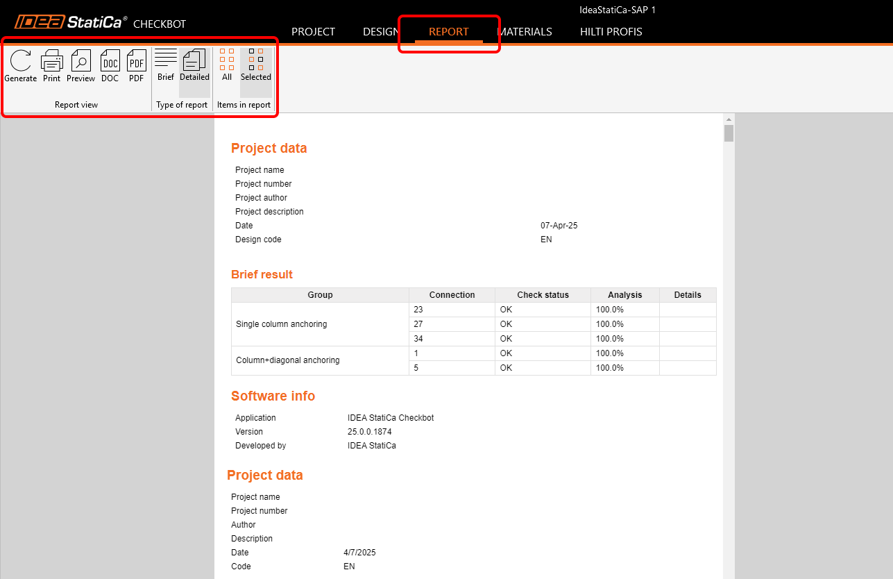 When Checkbot is linked to third-party software via a BIM link, it does not allow you to edit the properties of a member. If such changes are necessary, you can easily export the model to IDEA StatiCa Connection independently from the synchronized Checkbot model. You can export either only one connection or select multiple connections and save them all in one file, enabling you to print all reports of modelled connections at once.