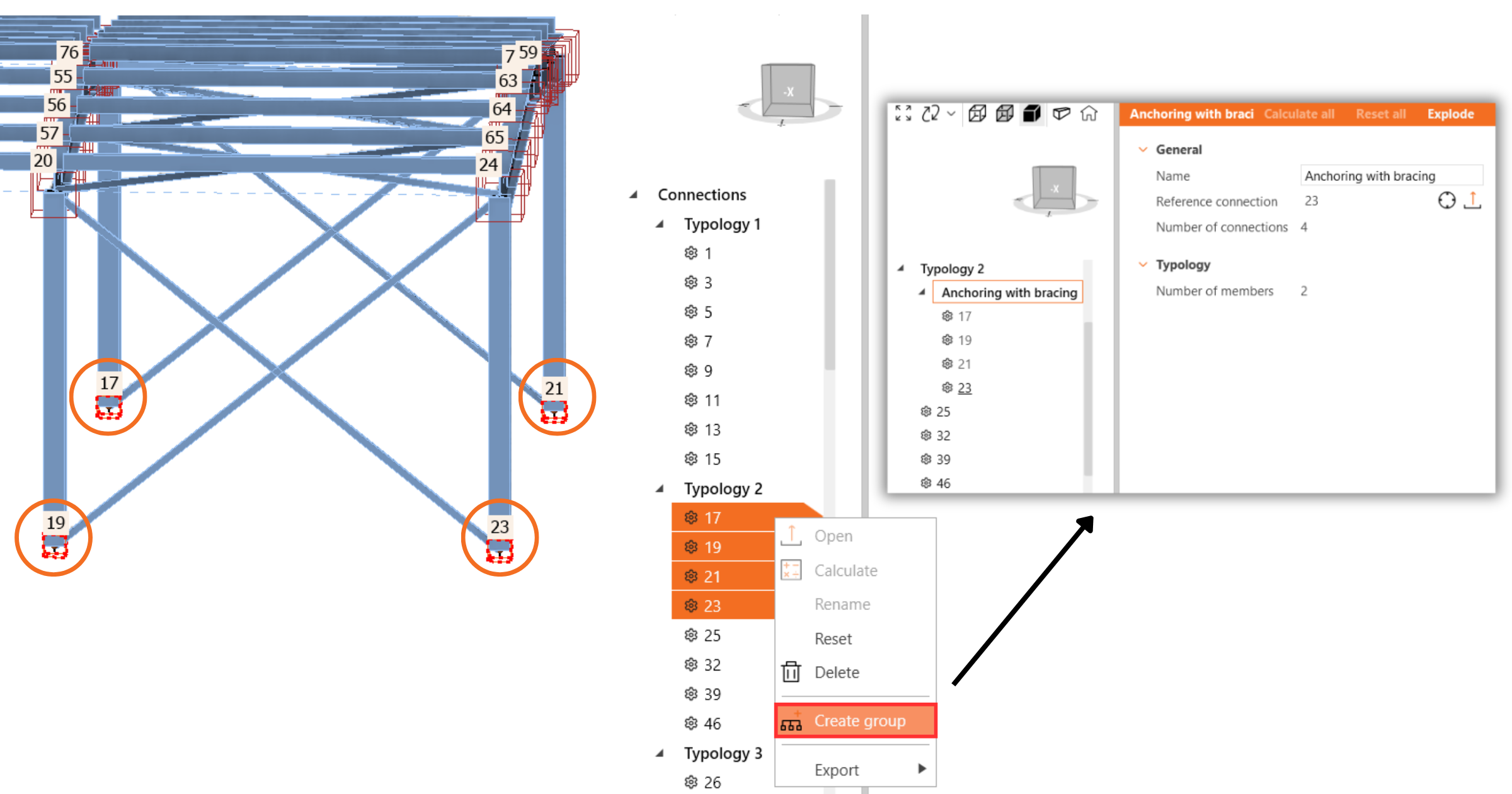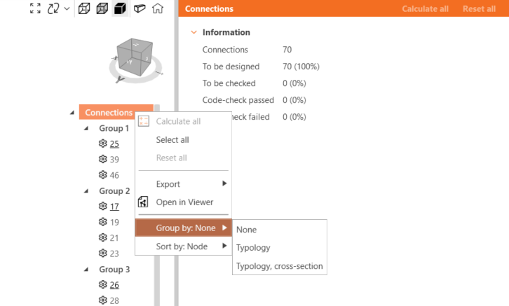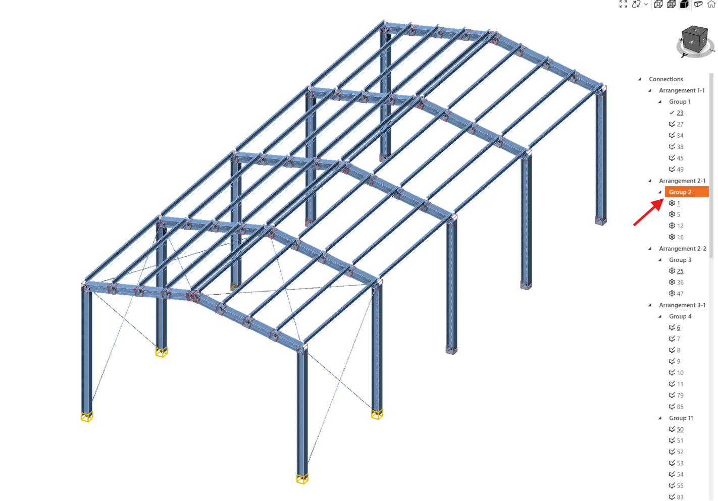 The grouping functionality automatically creates groups based on typology and/or cross-sections. The groups are then ordered from least complex to most complex based on the number of connected members. Every group is represented by the reference connection (underlined in the tree) is automatically designated as the parent connection that drives the design for the whole group. All other connections are treated as child connections