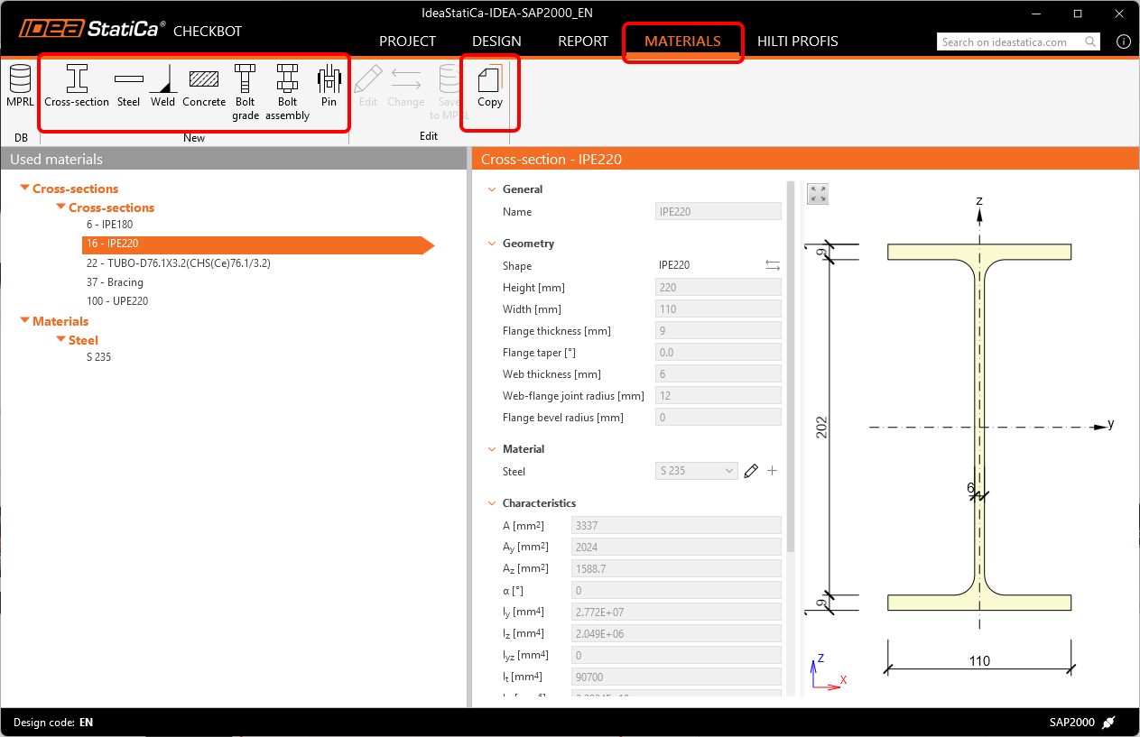 All materials used in Checkbot are listed in the Materials tab. All imported materials and cross-sections are disabled for making any changes. To modify their parameters, a copy needs to be created.