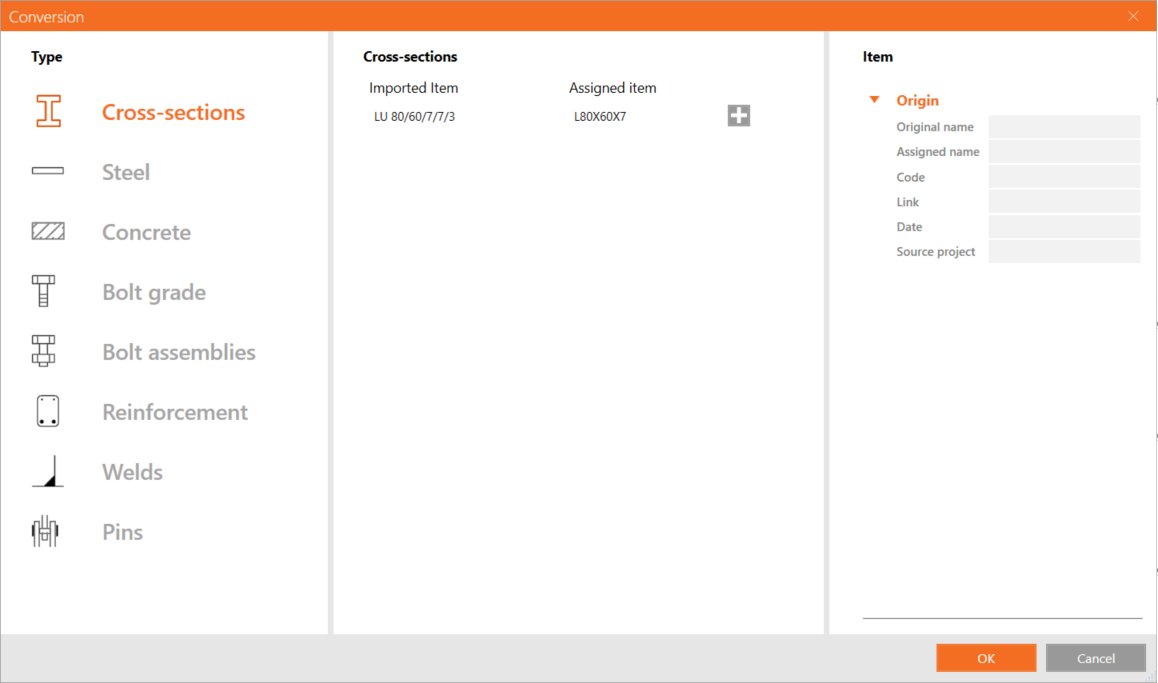 When a cross-section or a material is not recognized automatically during import, a new conversion tab appears to manually assign it from our section/material library. These pairs are then saved for future use within your user account and, therefore, do not need to be defined again.