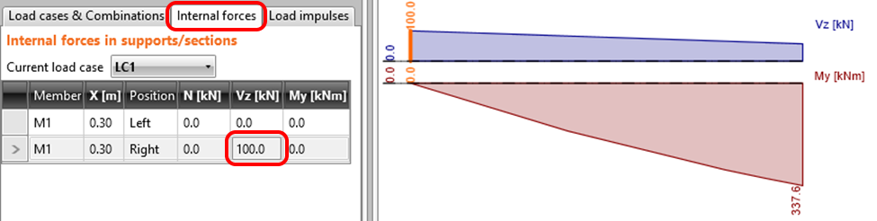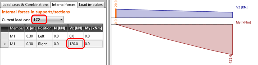 Modify load case LC1 for permanent effects. Apply reaction as a shear force Vz from the right position. You can see the change in the internal forces diagram.