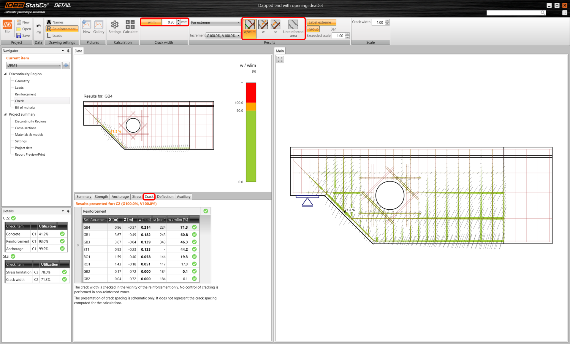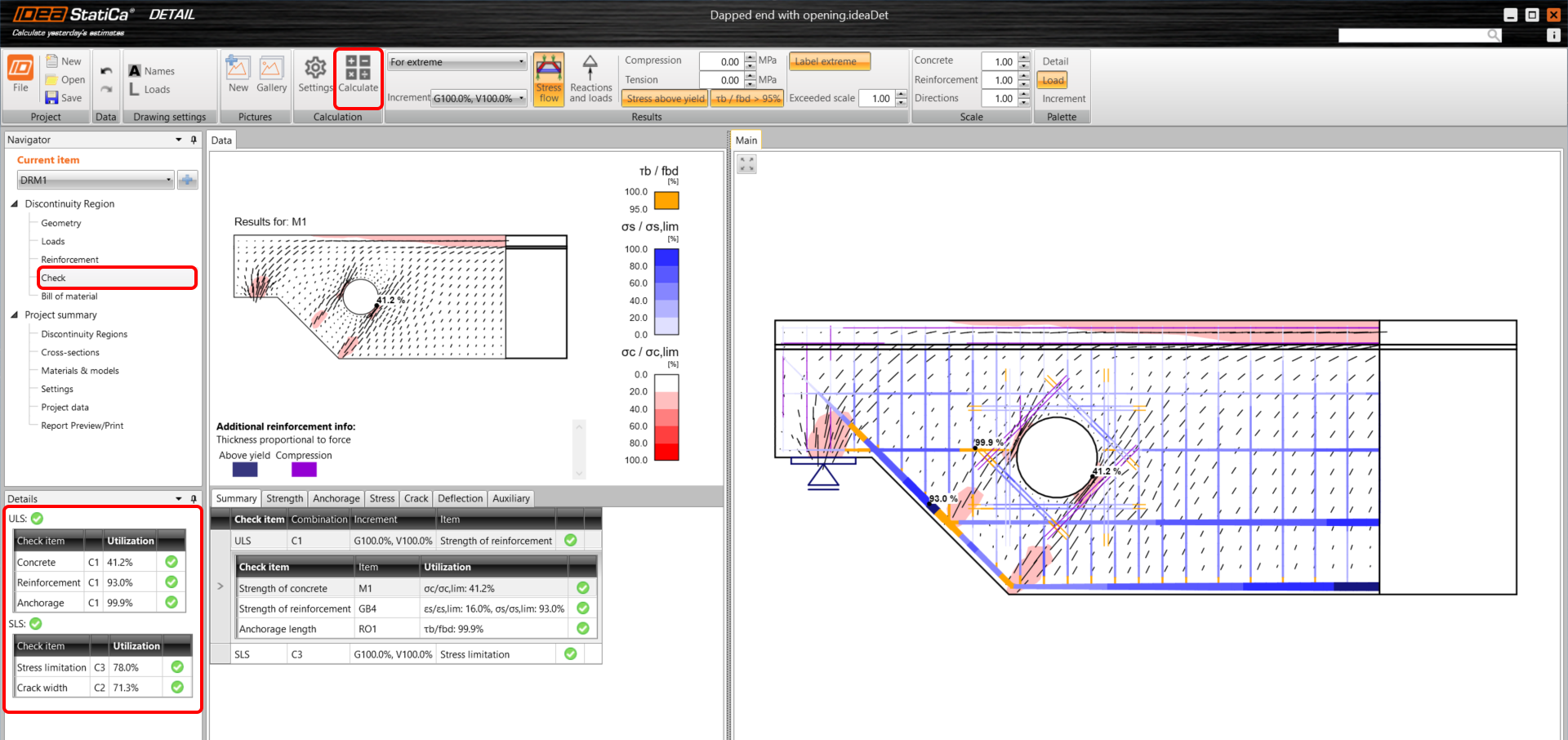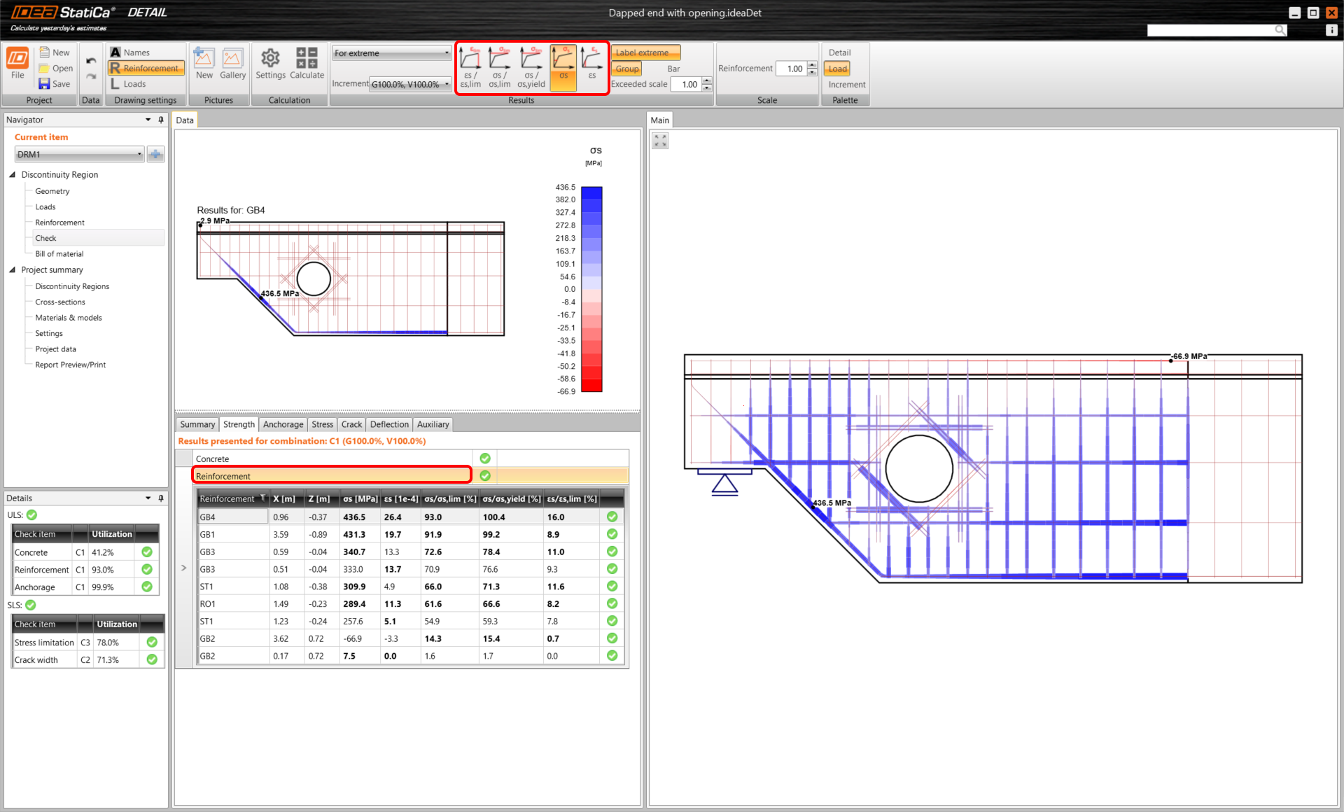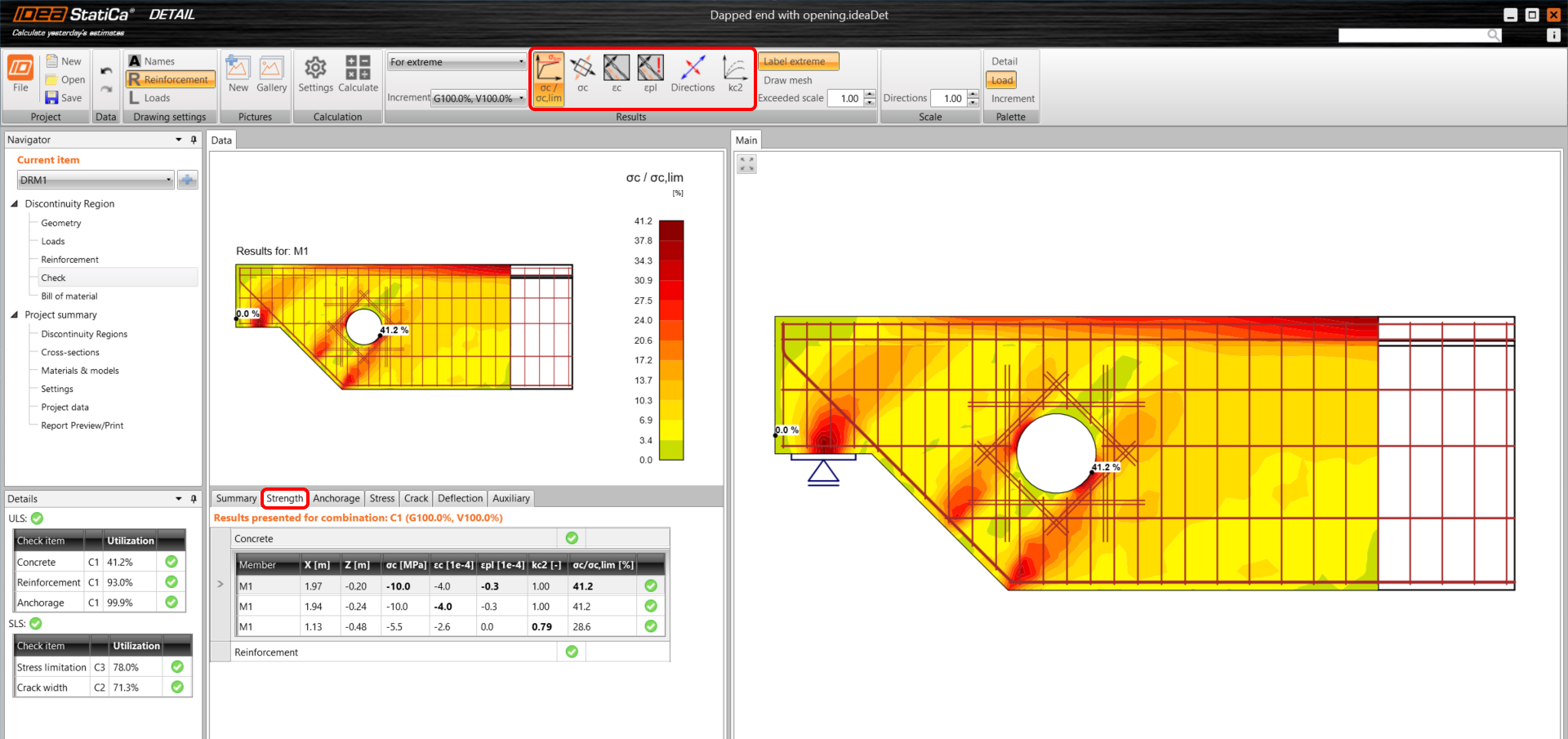 To go through detailed checks of each component, start with the Strength tab. This will show concrete checks such as utilization in stress, principal stresses, strains, and a map of reduction factor kc which can be switched on the ribbon.