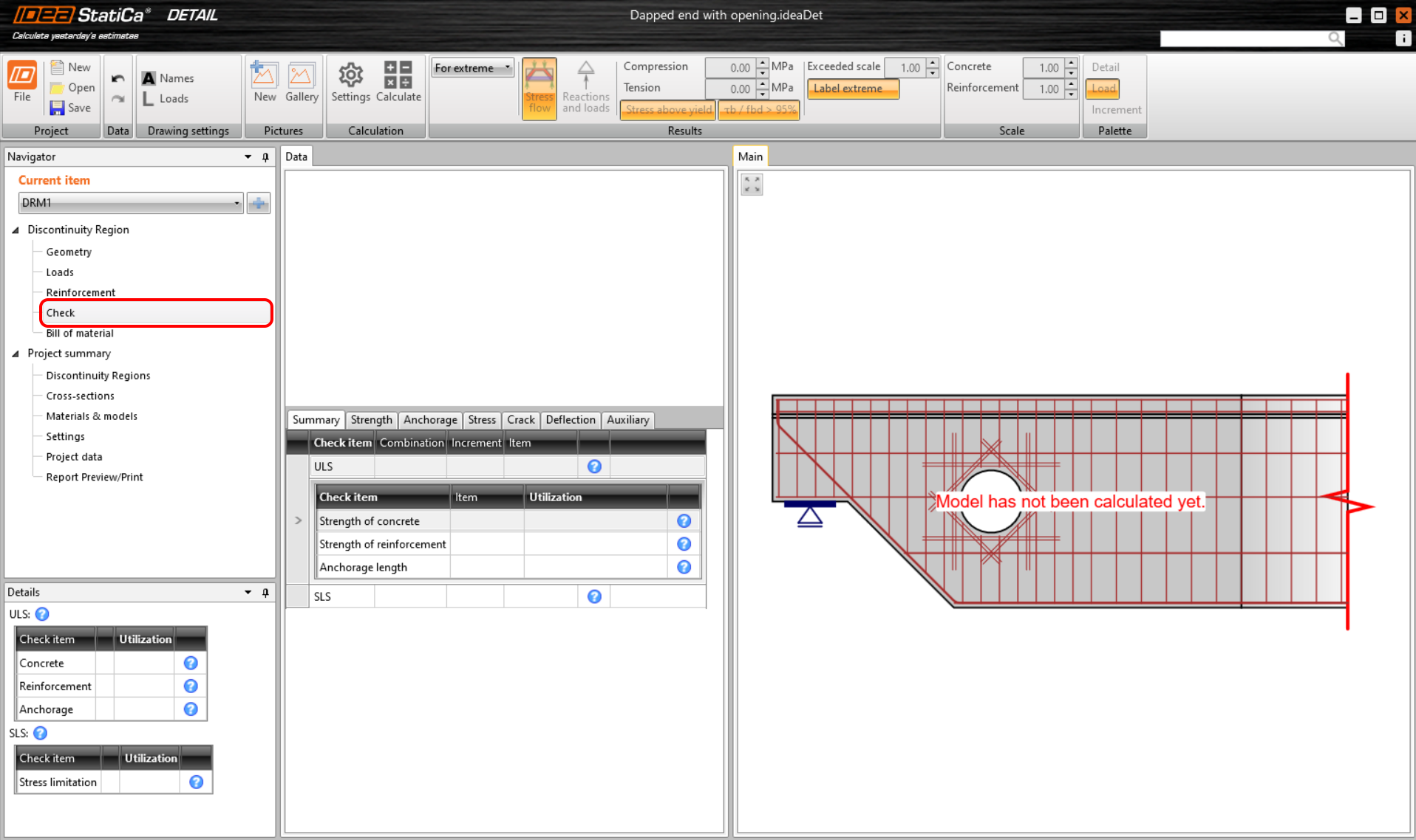 IDEA StatiCa Detail warns you by error messages and by red highlighted items, that the length of the detail is insufficient. The trimmed end of detail should be at a distance of at least 1.5*h from the last source of discontinuity. In this case, the governing source is opening and the sufficient length of the member is 4.6 m. All warnings should disappear after the elongation of member M1.