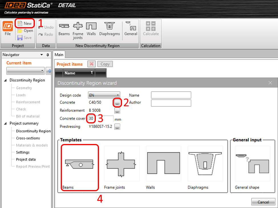 Start by launching IDEA StatiCa and select the application Detail. Create a new project by clicking New. The Wizard window is opened and you can start with a selection of proper concrete grade and cover. Then continue with Members 1D topology.