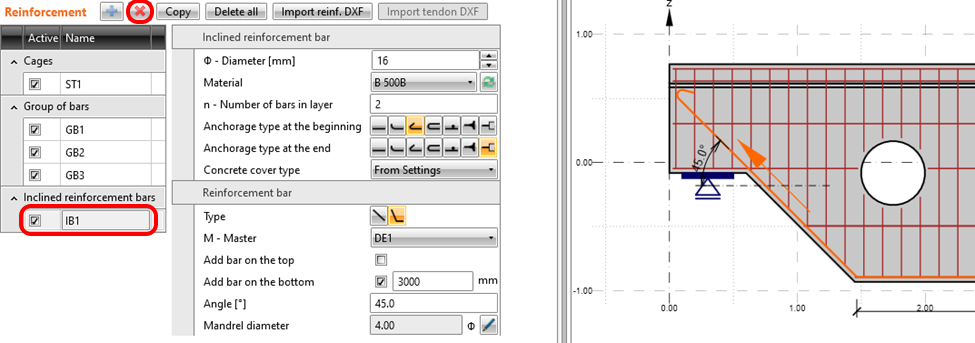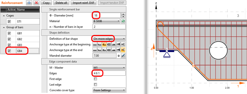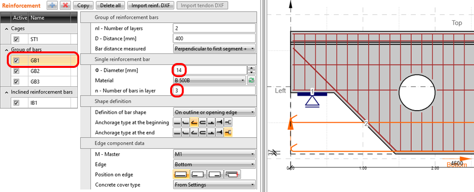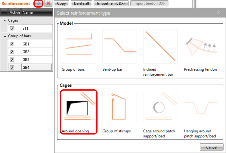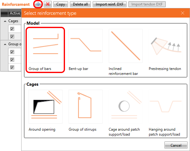 To add a new reinforcement item, use plus button and select the Group of bars in the Model section.