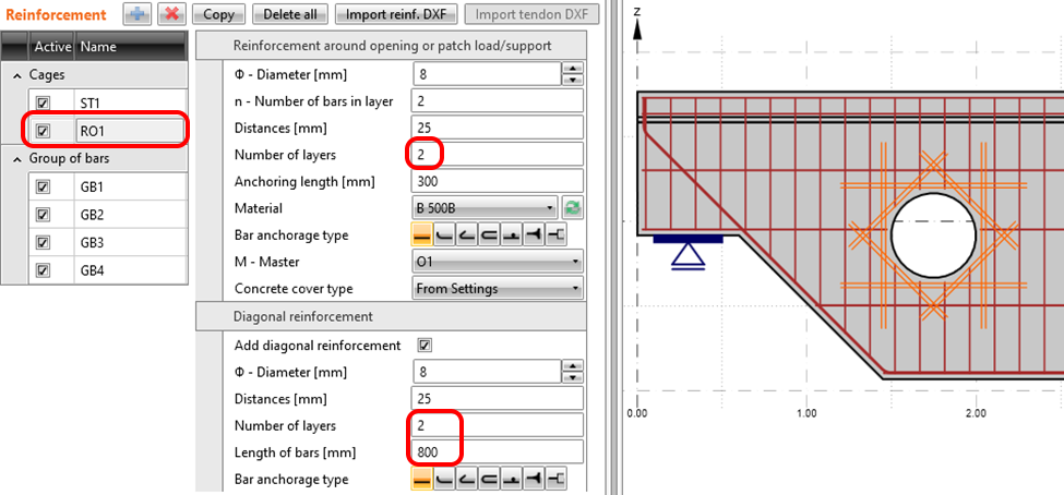 You added the opening to the original template and thus you need to add reinforcement around it. Again, press plus button and in Cages we select Around opening.