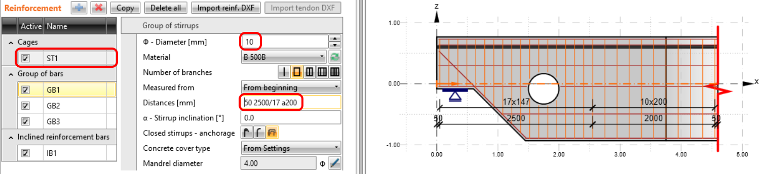 First item ST1 is used for stirrups modeling. Modify the diameter of the stirrups to 10 mm and change the distances between stirrups as 50 2500/17 a200. As you can see, you can combine several definitions of distances. This means, that first stirrup is positioned 50 mm from edge, then we fill 2.5 m by a division of 17 and fill the rest per 200 mm distance.