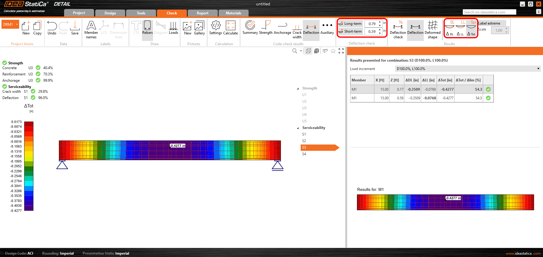 Deflections are calculated for each combination selected in the Design tab. However, checks are performed only if enabled using the Long-term and Short-term buttons in the top ribbon, with limits set according to ACI 318-19 Section 24.2. Time-dependent deflections are assessed for long-term combinations based on these limits. Users can also view deflections separately for Dead Load and Live Load or see the total deflection (DL + LL). Load type selection is available in the Design tab for each load case.
